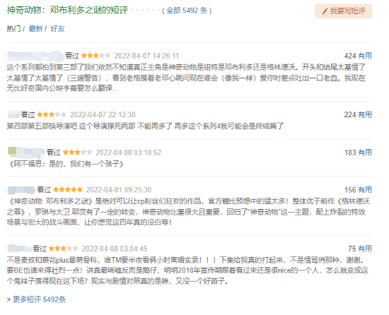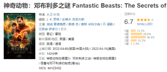 《神奇动物:邓布利多之谜》已于今日在中国大陆上映,豆瓣开分6.7分,目前已有超过10000名观众进行评价,近四成用户为其打了3星,仅有13.2%的用户为其打出5星。 截止发稿,该影片已经有了5492条短评,有用户认为该影片是值得邓布利多以及格林德沃CP粉丝狂热的作品,也有评论建议该系列下一部作品需要更换导演,否则下一部就是终结了。 《神奇动物:邓布利多之谜》是华纳兄弟影片公司出品,大卫·叶茨执导、 J·K·罗琳编剧,埃迪·雷德梅恩、凯瑟琳·沃特斯顿、裘德·洛、麦斯·米科尔森等位演员主演的奇幻冒险电影,是《神奇动物》系列电影第三作。 |