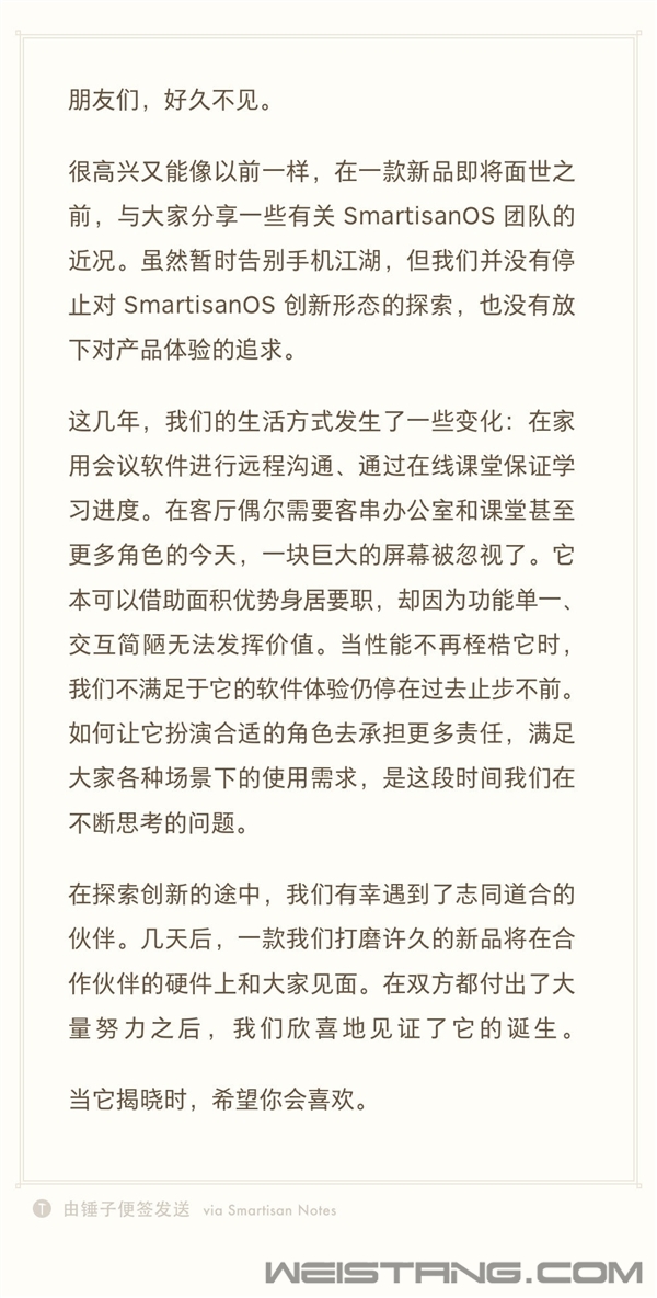 今天上午,曾经被罗永浩引以为傲的SmartisanOS官微突然发文宣布将回归,不过并不会是与手机相关,而是一种大屏设备。 官方表示:“很高兴又能像以前一样,在一款新品即将面世之前,与大家分享一些有关 SmartisanOS团队的近况。虽然暂时告别手机江湖,但我们并没有停止对SmartisanOS创新形态的探索,也没有放下对产品体验的追求。” 从这段发言已经就能明显看出,新品与手机产品没太大关系。 SmartisanOS官微在文中提到,这几年,我们的生活方式发生了一些变化:在家用会议软件进行远程沟通、通过在线课堂保证学习进度。 在客厅偶尔需要客串办公室和课堂甚至更多角色的今天,一块巨大的屏幕被忽视了。它本可以借助面积优势身居要职,却因为功能单一、交互简陋无法发挥价值。 当性能不再桎梏它时,我们不满足于它的软件体验仍停在过去止步不前。如何让它扮演合适的角色去承担更多责任,满足大家各种场景下的使用需求,是这段时间我们在不断思考的问题。 从这段介绍来看,新品可能会与电视或者投影有关。 SmartisanOS曾经的大屏产品:TNT 最后,官方还透露,与合作伙伴共同打磨的新硬件产品将在几天后和大家见面,让我们拭目以待吧。 不过需要注意的是,按此前消息来看SmartisanOS也与罗永浩脱离了关系,但在罗永浩要重回科技界之际宣布新品,着实会让人有些联想,但尚不清楚两者是否会有关联。 |