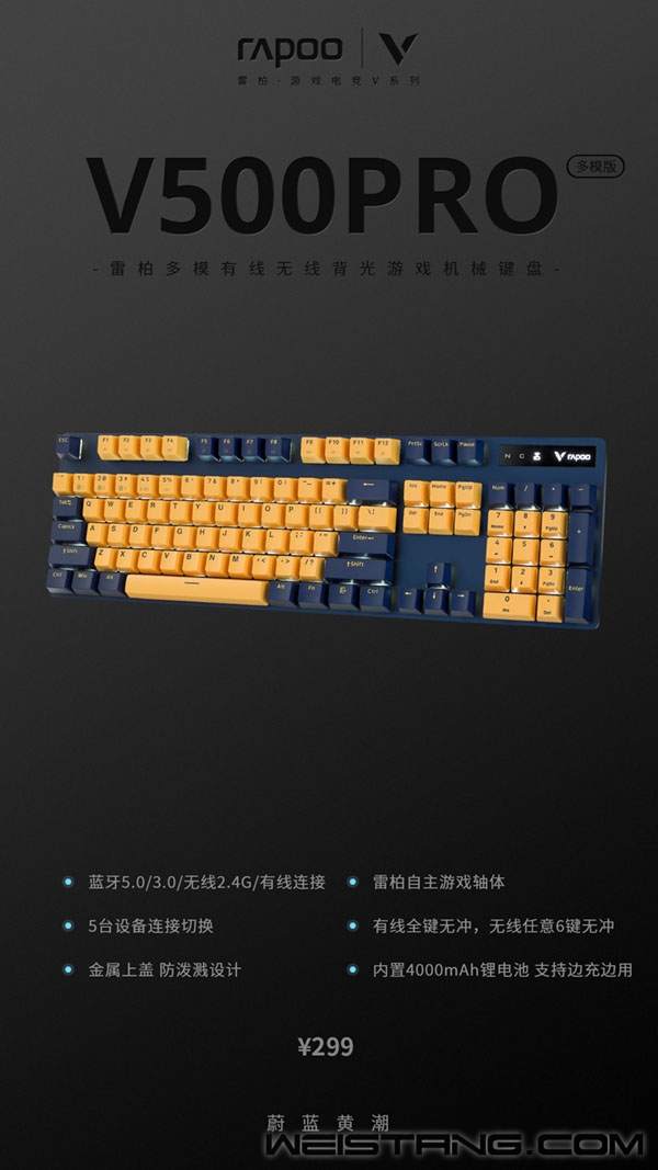 置身一座神秘的魔法城堡,蓝色迷雾明黄沙石是自由的号角,冰河铁马,银龙万丈。一场战斗即将开展。 冲击眼瞳弥漫神经,多模助攻视觉感知,打开情绪阀门,雷柏V500PRO蔚蓝黄潮多模版有线无线背光游戏机械键盘,焕新上市再下一城。 三大规矩强势助攻,多模切换、PBT键帽、长续航;青出于蓝而胜于蓝。 老规则—手感至上 色卡充能,太潮了!雷柏V500PRO蔚蓝黄潮多模版,金属上盖、PBT双色注塑键帽、悬浮式设计,精益求精的材料选择和标志性的鲜活明亮,颠覆性的色彩搭配和分布赋予竞技全新活力 。极地天光,冰原熠熠,纯白背光诠释极致之色,6种背光模式在风格视觉下,曙光初现势如星火。 依旧是雷柏自主游戏轴体的稳定耐用,黑、青、茶、红,6000万次单轴使用寿命,灵动触感,攻势迅猛,千万次敲击才是手感的时间度量;有线全键无冲、蓝牙/2.4G无线任意6键无冲,一触即发的召唤师峡谷、决胜分毫的P城街,以游戏为名的V500PRO多模版总能时刻拉满竞技的操作上线。 新配方—玩转场景 全情输出,专注贯穿场景,灌注精神的游戏画面需要瞬息的判断,放慢脚步的生活片段等待需求的交错。情绪调频节奏,跟的上速度的上限,自然也能玩得转场景的变换。V500PRO蔚蓝黄潮多模版,采用蓝牙5.0、3.0、无线2.4G和有线四种连接模式,最多支持5台设备连接切换,有线拉满响应,无线包容场景,搭配4000mAh锂电池,忘记电量焦虑才是多模切换的场景最优解。 自在如风,尽享无拘惬意,与洒脱邂逅,映衬率性姿态,12个Win系统多媒体快捷键,防泼溅设计,奔跑于江湖,历练于江湖,给舒适加码,给安心加码。 蔚蓝黄潮,是挑战的激情与荣光。 硬核解析,是「型」动自如。 雷柏V500PRO蔚蓝黄潮多模版有线无线背光游戏机械键盘,设计再进化,实力再加码。 |