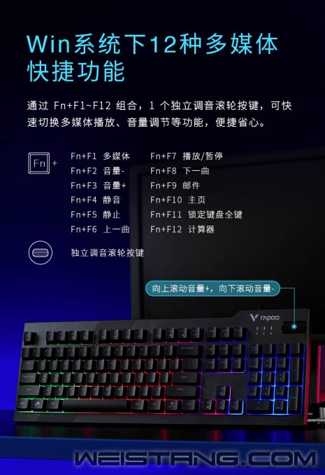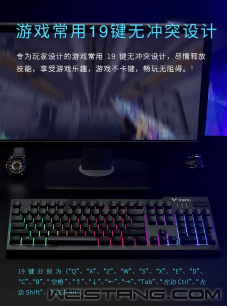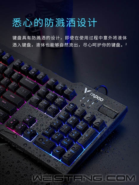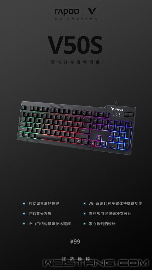 每一场游戏世界的战斗,是炫酷的、是快乐的、是激情的、是结束之后让你身心得以放松的。雷柏近日推出的V50S背光游戏键盘,带着游戏常用19键无冲设计、火山口结构内置薄膜材质、独立滚轮按键来袭,让游戏过程中更为舒适畅快。接下来让我们一起来看看吧。 键帽采用火山口结构设计,有效减少灰尘堆积,配合薄膜加持其中,享受指尖带来的轻敲快感,松弛有度,是的每下敲击更为舒适,为游戏添砖助力。 V50S采用104键全尺寸窄边框设计,精工制作的注塑上盖,辅以晒纹工艺,磨砂质感,整体呈现简约稳重的风格。 无光不电竞,灯光似乎也成了每个游戏键盘的标配,V50S自然也不能落下,键盘带有混彩背光系统,共有三种模式循环,八档灯光亮度、六档灯光速度可调节。精彩多多,氛围拉满。 通过Fn+F1-F12组合,1个独立调音滚轮按键,可快速切换多媒体播放、音量调节等功能,给你不同的开打方式,便捷省心。 键帽采用镭雕技术,用料扎实厚道,细颗粒触感,不易褪色,耐磨耐用,历久弥新。 助力游戏操作,键盘专为玩家设计的游戏常用19键无冲突设计,搭配方向键与WASD互换功能,Fn+W组合键即可智能切换WSAD与方向键,让玩家的操作习惯与技能连招衔接,尽情释放。 能提供强劲的性能,也能带来悉心的细节,键盘具有防溅洒设计,即使在使用过程中意外将液体洒入键盘,液体也能自然流出,不仅如此,通过Fn+Windows键即可实现Win键锁定/开启功能,防止在激烈的游戏中因误触Win键而切出画面。尽心悉心呵护玩家游戏内外的体验。 |