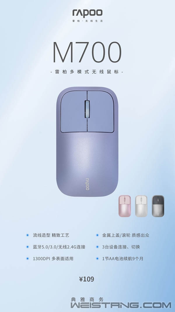硬朗与柔美不一定是反义词,也可以是一体中的不同面,互为补充衬托。不同的材料体现不同的风格,当二者合为一精妙呈现,雅致而充满力量感的特性被彻底唤醒。粉紫能构成生动鲜活的希翼,黑白两色也能呈现出千万种变化,色彩与材料碰撞出柔与硬的反差美,为商务办公带来的精致、智能、高效与安心。 各有姿态,向自由邀约。雷柏M700多模式无线鼠标彩色版,冷艳紫、流行粉、纯简白、韧劲黑正式上市。 ——关于色彩,复始更新的决心 「性格化」设计理念的应用,尝试透过日常办公生活去观察与理解,得到更加贴近真实的自我个性表达,而不仅仅是黑色作为代表。色彩,正在“大行其道”,作为另一种时髦选择,赋予了M700多模式无线鼠标更多情绪表达,刻画新时代的职场人群像。 流行粉,清甜率真,元气吸睛; 冷艳紫,傲娇俏皮,轻覆感性; 纯简白,慵懒自在,随性百变; 韧劲黑,沉稳姿态,诠释经典。 在个性化大于一切的时代,色彩更成为一种表达,一种自我和一种强调。亦如钟爱M700多模式无线鼠标冷艳紫的精致商务人士,鲜亮如它也有拧巴和矫情的时候,感性富于变化,也有令人欣赏的理智与犀利。 ——关于设计,满含心思的细节 延续最basic的元素——金属上盖,辅以细腻的磨砂表面处理,搭配流行粉、冷艳紫、纯简白等新配色则显得愈发有味道,质感出众,彰显规整有活力的时髦姿态,是生产力工具呈现更多面的可能性,不限风格。 主打「轻量感」,随性自在,中小手或差旅用户尤为适用。强造型感,左右手对称的人体工程学设计,恰到好处的背部曲线,仿佛有一把精准的量尺,给手掌预留了足够的发挥空间,无论是趴握或是抓握,都能舒适掌控。 ——关于性能,顺应规则的进阶 不受控制的,除了天马行空的创意之外,也可能是掌中之物。向内思辨,多一分会不受控制,少一分不够灵活,13000DPI高精度寻迹引擎,始终保持准确定位。向外试探,满足于皮革、布匹、纸张、木质、树脂等不同材质表面使用。 在动静之间展露松弛惬意的时髦韵味,静音微动设计,有效减少点击时的使用噪音。蓝牙5.0、蓝牙3.0和无线2.4G三种智能连接模式,最多可连接3台设备快速切换恣意创作,随时进入开挂状态。 雷柏M700多模式无线鼠标冷艳紫、流行粉、纯简白、韧劲黑四款精选配色从实用主义出发,也在强调高浓度的「自我愉悦与自我表达」。撑得起柔软,亦披得了硬朗,可进可退的游刃有余,点缀精致商务人士的职场生活。 |
