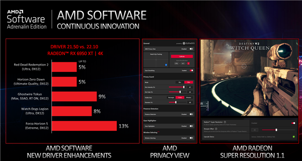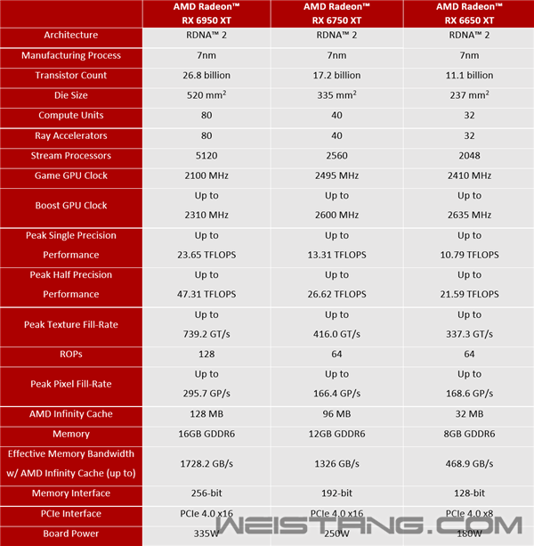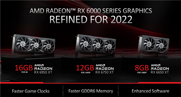 是不是在热切期盼全新工艺架构的RX 7000系列? 别急,今天,我们正式迎来了RX 6000系列的升级版,包括三款型号RX 6950 XT、RX 6750 XT、RX 6650 XT,都拥有更高的核心频率、显存频率,同时在驱动、软件方面也进行了优化升级。 RX 6x50 XT系列公版卡在造型设计上延续了RX 6000 XT系列的风格,只不过去掉了银色部分,变成了整体全黑色调,只有顶部的Radeon LOGO保持红色。 三款卡分别采用三风扇、8+8针接口,三风扇、8+6针接口,双风扇、8针接口,其中RX 6600 XT原本是单风扇,现在增加了一个,但需要注意的是,RX 6650 XT公版卡并不对外销售,市售全是非公版。 规格方面,RX 6950 XT基于完整的Navi 21 GPU核心,拥有80个计算单元、5120个流处理器、80个光追单元、128MB无限缓存,核心游戏频率2100MHz、加速频率2310MHz,相比于RX 6900 XT分别提升了85MHz、80MHz。 显存依然是256-bit 16GB GDDR6,等效频率来到18GHz,带宽576GB/s,再加上无限缓存带宽,合计高达1728.2GB/s。 整卡功耗从300W增加到335W。 RX 6750 XT的核心还是Navi 22,配备40个计算单元、2560个流处理器、40个光追核心、96MB无限缓存,核心游戏频率2495MHz、加速频率2600MHz,相比于RX 6700 XT分别提升了71MHz、19MHz。 192-bit 12GB GDDR6显存的频率也来到18GHz,带宽432GB/s,加上无限缓存合计1326GB/s。 整卡功耗从230W增加到250W。 RX 6650 XT的核心是Navi 23,集成32个计算单元、2048个流处理器、32个光追单元、32MB无限缓存,核心游戏频率2410MHz、加速频率2635MHz,相比于RX 6600 XT分别提升了51MHz、46MHz。 128-bit 8GB GDDR6显存的频率同样是18GHz,带宽288GB/s,加上无限缓存总计468.9GB/s。 整卡功耗从160W增加到180W。 RX 6950 XT、RX 6750 XT、RX 6650 XT即日起开始上市,国行建议零售价分别为8399元、4199元、3099元,官方指定竞品分别为RTX 3090、RTX 3070、RTX 3060。 非公版品牌包括华擎、华硕、映泰、微星、蓝宝石、迪兰、撼迅、讯景、盈通。 新卡发布的同时,AMD还介绍了驱动、技术方面的一些进步。 最新的22.10版驱动,针对新卡做了特别优化,RX 6950 XT 4K游戏性能普遍提升,《极限竞速:地平线5》可提升最多达13%。 同时,新驱动还支持隐私界面(Privacy View),支持RSR 1.1超分辨率技术,可一键开启,支持几乎任意游戏,并支持RX 5000/6000系列显卡、锐龙6000系列处理器。 FSR 1.0超分辨率技术已经普及到80多款游戏,第二代FSR 2.0也即将正式开放,升级时间算法,不但支持RX 400系列以来的所有A卡,甚至兼容N卡、I卡…… FSR 2.0的首发游戏是《死亡循环》,4K分辨率、最高画质下打开后可让平均帧率从73FPS提高到121FPS,提升幅度高达66%。 |