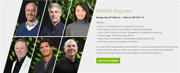 NVIDIA官方宣布,将于北京时间5月24日11-12点,在台北电脑展2022期间举办主题演讲发布会。 NVIDIA表示,届时将会展示AI如何推动企业数据中心,还有面向游戏玩家、创作者的最新产品、技术。 本次发布会有6位主讲人,虽然没有黄仁勋,但有GeForce业务高级副总裁Jeff Fisher,它曾在年初的CES 2022上宣布了RTX 3090 Ti。 从时间节点上,这次会上发布RTX 40系列是完全没有任何可能的,但是有大概率会透露一些消息,吊吊大家的胃口。 值得一提的是,同一天,AMD CEO苏姿丰也会发表主题演讲,预计会宣布Zen4架构下一代锐龙7000系列处理器的进一步消息,而且可能会披露RDNA3架构下一代RX 7000系列显卡。 |