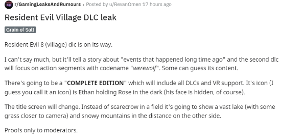 近日,在reddit论坛上一名叫“RevanOmen”的玩家透露了《生化危机8:村庄》DLC的细节。 其本人表示,游戏的DLC正在开发中,包含两款DLC。第一个DLC将讲述一个“很久以前发生的事件”;另一个DLC则专注于代号为“狼人(werewolf)”的动作元素。 此外,他还透露卡普空还将推出一个《生化危机8》完整版,将收录包括所有DLC和VR支持。 游戏的Icon图标是主角伊森在黑暗中抱着女儿Rose,伊森的脸被阴影遮住。同时进入游戏后的界面背景也不再是稻草人,而是一个巨大的湖泊,镜头附近有一些草,远处是一片雪山。 最后这名玩家还表示他已经向reddit版主提供证据,以证明自己爆料的真实性。 |