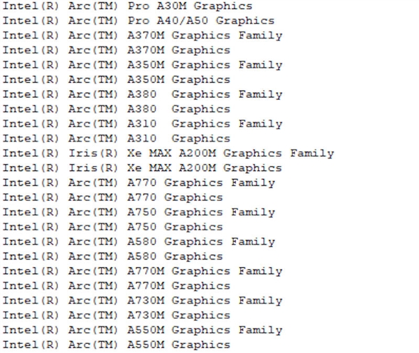 Intel近日发布了一款新的测试版显卡驱动30.0.101.1723,第一次官方确认了Arc锐炫显卡的桌面型号、工作站型号,并泄露了几款新的笔记本型号。 驱动显示,Intel Arc桌面显卡型号有:A770、A750、A580、A380、A310。 对比之前爆料,少了最顶级的A780,入门级的A350,看起来它们要晚一些发布了。 笔记本型号此前官宣了最低端的A350M、A370M,现在出现了高端和主流的A770M、A730M、A550M。 工作站型号是第一次曝光,目前只有Pro A40、Pro A50、Pro A30M。 按照Intel官方的说法,Arc A300系列桌面独显将于二季度率先在中国市场推出,方式是OEM或整机,零售渠道随后会铺开。 从多个消息源获得的最新说法则称,Arc桌面显卡和移动版类似,在二季度末也只是纸面发布,真正上市要到夏末,也就是8月前后。 工作站版本官方说法是第三季度上市,此前已经看到戴尔等多款移动工作站预告采纳。 |
