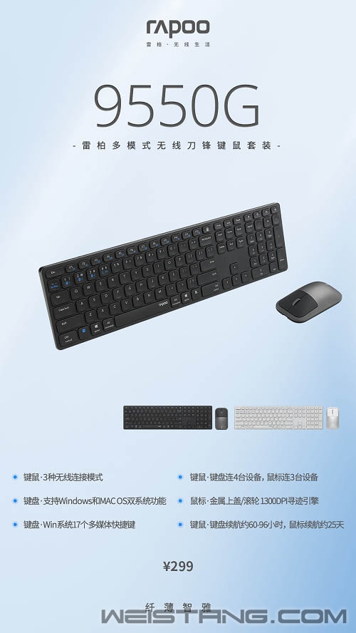 当历经千辛万苦登上山顶,是为了欣赏全世界波澜壮阔的风景,还是为了让山下的人看到自己。但如果一直缓速前行,谁又能看到你?犹如工作一般,唯快速前行,方能更好拥抱生活的美景。在办公这条前行的道路上,效率或为破局之举! 蓝牙5.0/3.0/无线2.4G三种连接方式、多设备切换、110键全尺寸布局,标志性刀锋设计,精选铝合金材质一体成型,精致典雅注入桌面场景。雷柏9550G多模式无线刀锋键鼠套装上市,破局来袭! 多措并举,持之以恒~键鼠 工作总是在不断的变化之中,所谓众人抬柴才能火焰高,9550G提供蓝牙5.0/3.0和无线2.4G三种智能连接模式,配合多设备切换,键盘支持同时连接4台设备,鼠标支持同时连接3台设备,可在各个设备间快速切换,传输稳定可靠,在面对繁多工作时,效率首当其冲,尽管孤身作战,团队形影亦能展现。当键鼠成为效率输出的首要生产工具,300mAh锂电池,带来键盘60-96小时,鼠标约25天的续航时长,给效率输出的持续性一个释放的赛道,效率能量燃料就绪,速度开始飙升。 经典刀锋设计,全尺寸布局~键盘 工作与生活的平衡,是大多数人孜孜不倦追求的目标。如果有人问你,对于工作和生活,你期待的场景是怎样的?键盘采取雷柏标志性刀锋设计,厚度最薄处仅5mm,边框与底盖采用精选铝合金材质一体成型,整体带来大道至简的视觉感,给桌面场景加点料,给生活带来一份精致典雅。110键全尺寸布局,带有数字小键盘,更全面的配列加持的也更多,Windows、MAC OS系统双兼容,Windows系统下17个多媒体功能快捷键。配备刀锋系列经典的剪刀脚结构,内辅柔软硅胶颗粒,外装巧克力独立键帽,每一下输入均匀受力,回弹迅速带来轻盈体感,让办公体验层层加码,办公效率,生活娱乐尽藏其中。 人体工程学,商务化~鼠标 是静态时的优雅,是动态时的神采灵动,上盖整面金属一次冲压成型,细腻磨砂表面处理点缀,辅以左右对称设计,小巧浅薄下蕴藏着恰到好处的曲线弧度。不止于此,便于携带的72g身躯内,蕴含着1300DPI高精度寻迹引擎,多介质表面滑动无阻,配合静音微动,无论身处何地,打造一个静谧的办公环境。因静而从容,因从容而优雅。 多配列,锁定场景化办公 78键9050G、99键9350G、110键9550G,不同的配列应对不同场景的使用需求,一如既往的刀锋细腻感知体验,锁定商务办公高效原动力。铝合金一体成型与多功能协同体验贯彻刀锋键盘设计,以商务办公场景感知作为产品设计的航标,用外观设计+功能为核心打造人性化办公外设品类。雷柏9550G多模无线刀锋键鼠,于工作和生活中带来一个平衡的答案,给办公效率带来一个破局之举。 |
