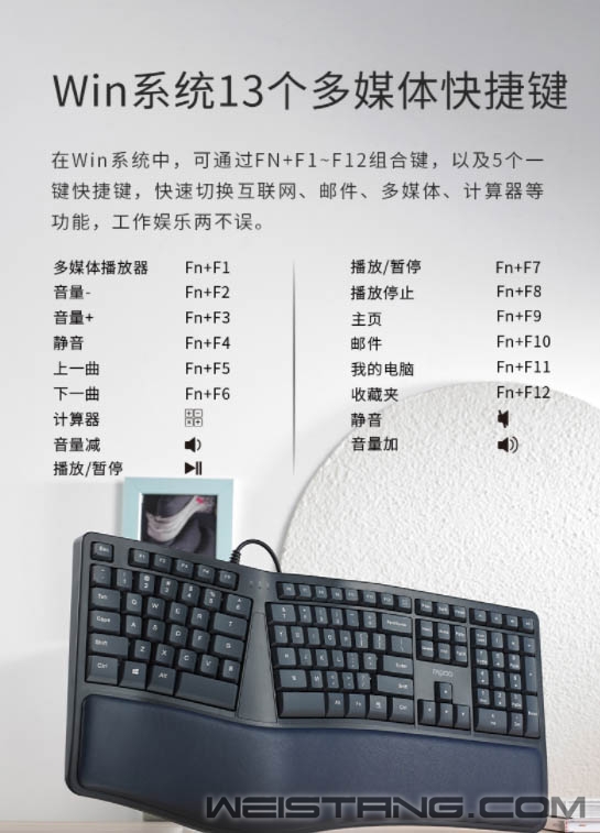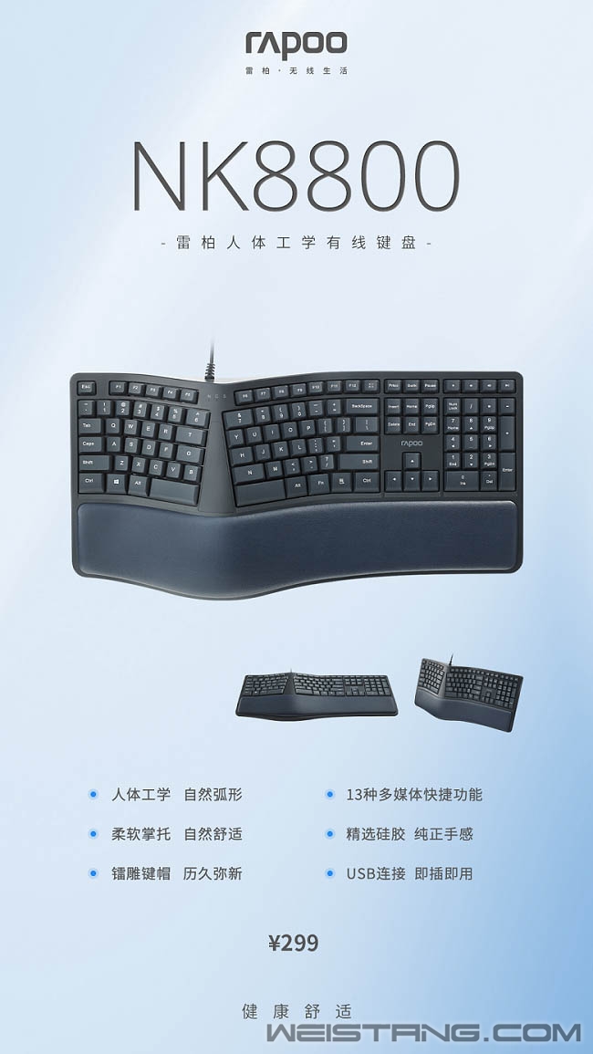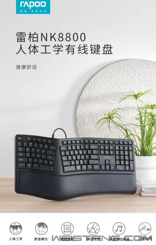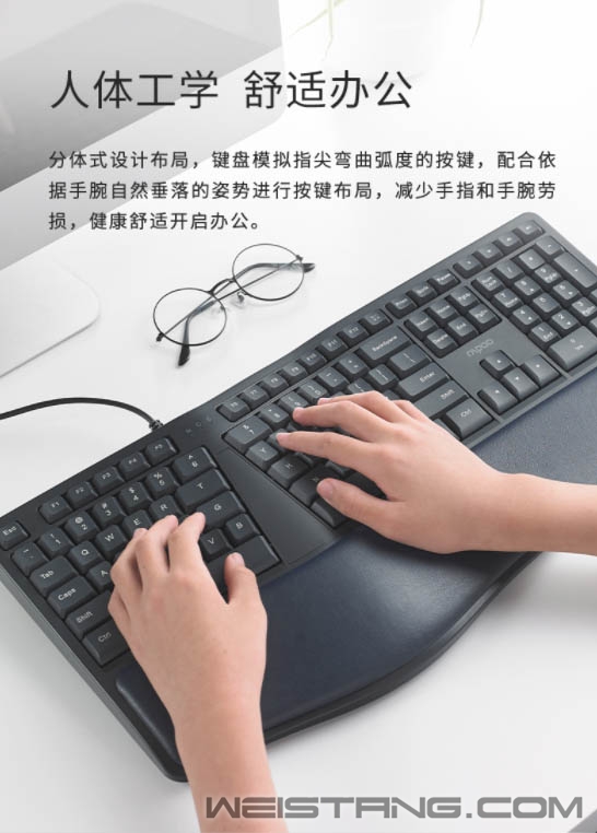 寻找一种办公感觉,是舒适的、自然的,没有刻意、没有迎合。近日,雷柏推出的NK8800人体工学有线键盘,采用分体式设计布局、辅以舒适掌托、精选高品质硅胶、带来舒适自然的输入体验,接下来让我们一起看看吧。 键盘采用分体式设计,模拟指尖弯曲弧度按键,按键布局亦依据手腕自然垂落的姿势进行按键布局,让使用者在输入时减少手指与手腕劳损,开启舒适、健康的办公之旅。 按键布局下方是自然弧度的软垫掌托,在17°的黄金放置角度下,使手腕始终留在舒适的位置,手臂自然舒展,配合键盘背设的脚架,灵活调节工作角度,让舒适性往前多走一步,长时间码字者的贴心助手。 有舒适必然也有贴心便捷,键盘在Win系统中,可通过FN+F1—F12组合键,以及5个一键快捷键,快速切换互联网、邮件、多媒体、计算器等工作,工作娱乐两不误,身心皆得到舒展性。 NK8800按键字符印刷采用镭雕技术,耐磨耐用,配合精挑细选的高品质硅胶,恰到好处的敲击手感与回弹力度,让轻松愉快离你近一点,让按键褪色、打油离你远一点。 背后不用角度共设有5个防滑脚垫,多方面配合,让持续性码字键盘亦能稳固不移。 省去繁琐开启步骤,无需安装任何的驱动软件,通过USB接口连接,插上即可开启办公。 |
