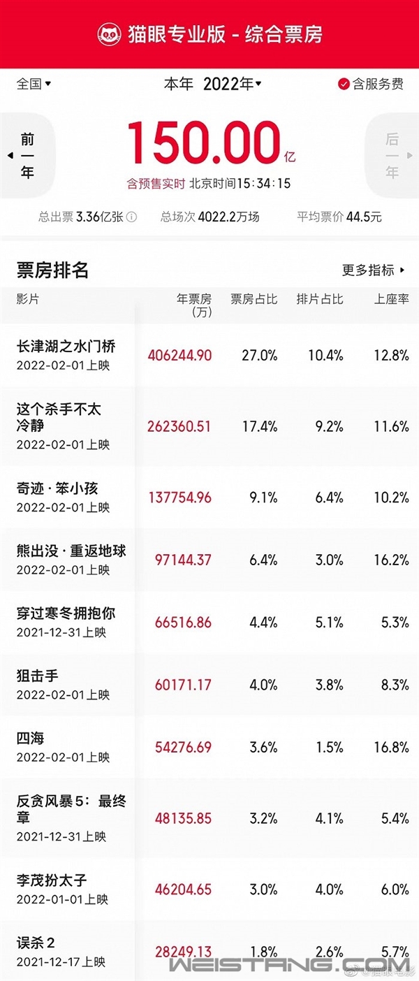 5月19日,猫眼电影专业版发布数据称,,截至5月19日,2022年全国院线电影总票房突破150亿元。 同时还公布了今年票房的TOP10名单,吴京主演的战争大片《长津湖之水门桥》以40.62亿的成绩位列第一,遥遥领先其他电影。 《长津湖之水门桥》将于2月1日大年初一8点上映,时长149分钟,是续作,也是该系列的结局,讲述发生在1950年12月的水门桥战役,长津湖战役的后期,围绕架在长津湖引水管道上的水门桥展开,这是美军撤退线路上的喉舌之处。 电影由《长津湖》原班人马打造,陈凯歌、徐克、林超贤联合执导,吴京、易烊千玺、朱亚文、李晨、胡军、段奕宏、韩东君、张涵予联合主演。 2022年国内电影票房TOP10名单: 1、《长津湖之水门桥》40.62亿 2、《这个杀手不太冷静》26.23亿 3、《奇迹·笨小孩》13.77亿 4、《熊出没·重返地球》9.71亿 5、《穿过寒冬拥抱你》6.65亿(累计9.36亿) 6、《狙击手》6.01亿 7、《四海》5.42亿 8、《反贪风暴5:最终章》4.81亿(累计6.28亿) 9、《李茂扮太子》4.62亿 10、《误杀2》2.82亿(累计11.21亿) |