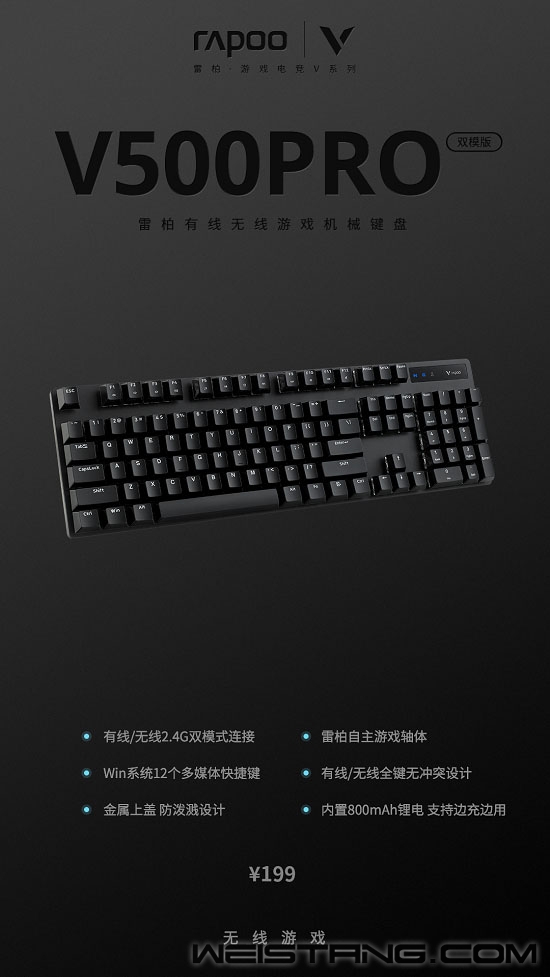 仿佛身处一片虚空混沌竞技场之中,新技能或是破局之举,一场淘汰战斗正式开启。 性能升级,双模助力,打开格局,雷柏V500PRO双模版有线无线游戏机械键盘,荣耀登场。 三大BUFF环绕,有线/无线切换、全键无冲、长久续航;加持BUFF,冲出重围。 新技能,性能拉满 全力输出,这是一场技能的火拼,在这个虚无的修罗场里,性能载入的毫无保留,蓄势待发,仿佛正是吹响这场战斗的号角,V500PRO双模版采用有线、无线两种连接模式,有线拉满响应,无线玩转战场,搭配800mAh高能锂电,让在这场战斗中,持续保持能量,输出双重加倍,才是制胜破局而出的最佳之解。 手感在线,舒适加倍 战力外溢,武装霸气的无形环绕!雷柏V500PRO双模版,整体简约窄边框中是磨砂金属的上盖属性、镭雕技术键帽,悬浮式设计、精选金属材质和暗夜纯黑的色彩注入,战斗气息无形环绕,赋予竞技全新加成,在浑浊的暗夜战场中穿行。 熟悉雷柏自主游戏轴体的稳定耐用,黑、青、茶、红四种选择灵动应对,单轴6000万次寿命,千万次的敲击是手感长期持续的长久增益;有线/无线下全键盘任意按键无冲,虚无的修罗场、天马行空的未来战场、暗潮涌动的绝地海岛,V500PRO双模版时刻增益操作在线。 听风吹,随风而去,与洒脱相遇,与自由自在,无拘无束相拥,12个Win系统多媒体快捷键,悉心的防溅洒设计,和繁杂意外告个别,让舒适安心,常伴吾身。 熟悉的性能,实力加码,是战场上的破局之举,亦是打开快意阀门的开关。V500PRO双模版有线无线游戏机械键盘,有线/无线两种模式,全键无冲、高能锂电;三层BUFF叠加增益,突出重围,拿下这一城;官方指导价199元,现已上市! |