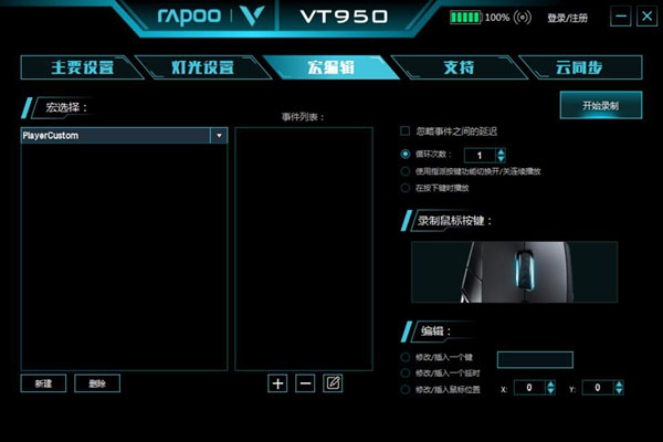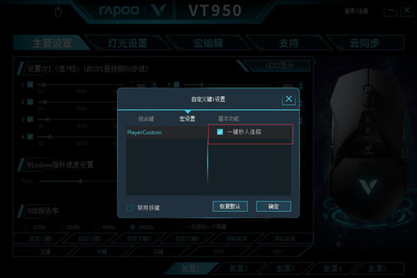 “路霸”作为守望先锋里的一个英雄,可以用他标志性的链钩将敌人勾到他的身边,然后用爆裂枪重创他们。他能够承受巨大的伤害,还可以通过呼吸器恢复生命值。笔者将使用VT950电竞游戏鼠标强大的宏定义功能教你玩出一键秒人的“路霸”。 路霸众多招式中的秒人连招,可以将众多的英雄秒杀,我们可以通过宏定义的设置,解决您的手速问题,一键能发出路霸的秒人连招,让你在游戏中快人一步,离胜利更近一步。 步骤一:打开驱动,选中雷柏VT950的宏编辑。点击“宏编辑”,再点击左下角的“新建”,命名为“一键秒人连招”。 步骤二:将“一键秒人连招”的一系列操作进行录制。点击开始录制,选择“录制鼠标按键”,开始一些列操作“按下右键-shift-按下左键-V” 步骤三:设置好一键秒人连招之后,回到主页面中,以自定义键1为例,在设置页面,点击宏编辑,选择刚才设置好的“一键秒人连招”命令,即可使用。 设置完成后,便可在《守望先锋》中,可以通过点击VT950的自定义1键来一键触发秒人连招,让你用路霸横扫秒杀众多英雄,简单粗暴就是干! 老牌实力大厂,国产外设领军品牌雷柏(RAPOO)发布的VT950电竞游戏鼠标,拥有1680万色双区域RGB灯光系统,客制化的OLED显示屏,随时知悉战鼠的一举一动。搭载P3389的专业传感器,可在50-16000DPI中以50DPI为单位逐级微调,5000万次的清脆手感微动开关,性能和手感得到极大提升;配备的1颗10克重的可拆卸配重块,0能够适当调整鼠标的重心和重量。板载内存、编织线材、镀金USB接口、特氟龙材质脚垫,优秀的工业设计与表面材质保证了长时间游戏的舒适度。仅售399元,相信它一定会成为你首选的游戏利器,给你畅快的游戏操作体验。 |