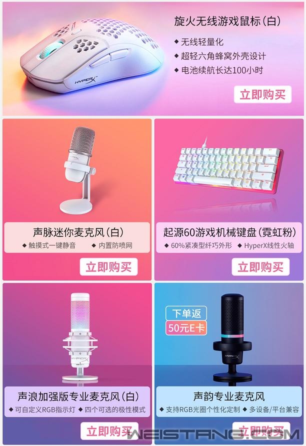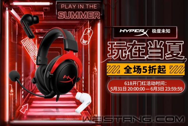 暑期临近,很多玩家都开始跃跃欲试,升级自己的游戏外设,正所谓兵马未动粮草先行。目前,极度未知(HyperX)上半年备受瞩目的618电商节已经全面开启,天猫HyperX旗舰店中全场不仅5折起,还有机会赢取高性能游戏笔记本、免单、福袋等惊喜大礼。玩在当夏,买到就是赚到,大奖不等人,赶快趁好价加购下单吧! 活动环环相套 惊喜大礼送不停 HyperX 618天猫开门红中最受关注的就是直播间抽大奖活动了!奖品为OMEN暗影精灵8 Pro高性能游戏本,只要5月31日20点-6月3日活动期间在店铺购买三件及以上的商品,且总金额超过2000元就可以参与抽奖。5月31日20:00-6月3日,前30名付尾款即可享受半价优惠,如此强有力的活动还不赶紧定好闹钟抢优惠! 活动期间,购买HyperX阿尔法无线游戏耳机的用户还将额外获赠价格不菲的HyperX精英2游戏机械键盘,买一得二,外设两件套带回家,买到就是赚到! 全场五折起 整套外设带“惠”家 除了上述活动外,HyperX更为大家精心准备了多款外设产品,让玩家在即将到来的暑假战个痛快! HyperX毒刺灵动版游戏耳机是为PC玩家打造的游戏利器,凭借轻量化设计备受玩家青睐,耳机拥有40mm驱动单元,旋转式降噪麦克风以及HyperX标志性的舒适使用体验,是一款高质量和高性价比兼顾的游戏耳机。 HyperX游戏耳机中的经典当属飓风游戏耳机,除了经典的黑红色配色外,还有青铜色以及霓虹粉两种颜色可供玩家选择。经典源于其高规格性能,53mm大尺寸驱动单元,USB声卡线控、虚拟7.1环绕立体声,为用户带来出色Hi-Fi游戏体验,而且飓风游戏耳机出色的人体工学头梁和隔音耳罩更是为玩家提供了舒适的佩戴体验,长久游戏也不易疲倦。 HyperX飓风无线游戏耳机则是将经典的飓风游戏耳机无线化,采用成熟的2.4GHz无线连接,具有传输距离远、低延迟、抗干扰的特性,此外其30小时的超长续航可以陪伴玩家激战一整夜依然保持电力充沛。在规格上,53mm大尺寸驱动单元、7.1环绕立体声、可拆卸降噪麦克风、内置麦克风侦听,还有结实耐用的铝合金框架以及标志性的HyperX舒适度。 HyperX最新款的阿尔法无线游戏耳机一经问世就震撼了业界,不仅有黑科技双音腔技术提供清晰、准确的声音表现,其长达300小时的续航时间更是惊人,被许多玩家称为“核动力”续航。活动期间购买阿尔法无线游戏耳机还赠送HyperX精英2游戏机械键盘,机会难得不容错过。 无线耳机中HyperX天箭游戏耳机也是经典之一,90°旋转耳罩和酷炫LED灯效可以彰显玩家的个性风格,更拥有30小时的长效续航,舒适的佩戴体验,再加上标志性的的外观设计平易近人的价格,使天箭在无数玩家的心目中占有一席之地。 手游玩家对HyperX云雀TWS真无线耳机青睐有加不无道理,作为HyperX推出的第一款真无线蓝牙耳机,相比耳罩式游戏耳机,入耳式耳塞更适合在夏天佩戴。并且,它拥有10mm驱动单元, IPX4级防水性能,支持蓝牙快速连接,并可通过触控进行耳机多项设置,耳机采用人体工学设计,并提供了三个不同尺寸的硅胶耳塞套,可带来便捷和舒适佩戴体验,目前有黑色与白色供玩家选择。 键盘方面,HyperX火星2游戏机械键盘与其他游戏机械键盘有所不同,其经过了长时间的调研并综合玩家的需求和审美研发而成,可以说是为广大游戏玩家量身定制的一款游戏机械键盘,火星2游戏机械键盘拥有HyperX自主火轴、PBT闭口透光键帽、炫彩RGB动态光效、内置静音棉,玩家的很多细节需求被一一满足,而且性价比极高,是活动期间颇具竞争力的一款游戏键盘。 炎炎夏日来临之际,玩家们对于鼠标的选择反而更容易一些,HyperX为玩家们准备了旋火游戏鼠标和旋火无线游戏鼠标。旋火系列游戏鼠标全身遍布镂空孔洞,可有效促进空气流通,时刻保持手部干爽,告别黏腻手汗。最新推出的旋火无线游戏鼠标更值得游戏玩家选择,毕竟没有线材的羁绊更显自由顺畅,装备的Pixart 3335高性能传感器和TTC防尘金微动可带来精准定位,低延迟的2.4GHz无线传输以及高达100小时的无线续航能力让玩家不必再为延迟和电量问题所困扰。 随着越来越多的游戏玩家、解说、主播对于麦克风音质的需求,独立麦克风也和键盘、鼠标、耳机一样成为玩家们必备的外设装备之一了。HyperX根据不同的用户需求,推出了声脉迷你麦克风、声浪专业麦克风以及声浪加强版专业麦克风。其中声脉迷你麦克风简单易用,采用实用的心形拾音模式,对正前方的声音更敏感;声浪专业麦克风则功能齐全,拥有四个可选极性模式;声浪加强版专业麦克风则拥有可定制RGB动态光效。 玩家们如果想配一套高性价比的游戏套装,推荐选HyperX毒刺灵动版游戏耳机、火星2游戏机械键盘、旋火游戏鼠标和声脉麦克风;预算充裕一些还可以把鼠标和耳机升级成无线外设,推荐选择HyperX天箭游戏耳机和旋火无线游戏鼠标;而对于高端玩家,想尽可能一步到位的话,那就选HyperX阿尔法无线游戏耳机,键盘则使用赠送的精英2游戏机械键盘,鼠标还是选旋火无线游戏鼠标,麦克风当然要选择最酷炫的声浪加强版专业麦克风。玩家们如果想玩在当夏,尽兴游戏的话,那就趁活动期间的满满优惠,把全套外设带回家。 除了618电商节活动之外,天猫HyperX旗舰店在6月还有诸多新品开售,可以帮助玩家们打造一套个性清新的游戏套装,旋火无线游戏鼠标(白)、起源60游戏机械键盘(霓虹粉)、声脉迷你麦克风(皓月白)、声浪加强版专业麦克风(皓月白)