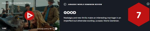 《侏罗纪世界3:统治》的媒体评分现已正式解禁,IGN为本片给出7分评价。 评分:7分 良好 怀旧与惊险刺激在不完美却令人兴奋的《侏罗纪世界3:统治》中形成了有趣的结合。 总评: 《侏罗纪世界:统治》是一场对《侏罗纪公园》系列的不完美的补充——特别是对一些新种恐龙的粗略介绍以及对观众智商的侮辱。但他仍设法在怀旧情绪、史前生物以及新世界漫游的挑战中融合成了一些令人印象深刻的东西。 据了解,该作将于6月10日内地上映,也就是本周五。这一部片名为“统治”,是《侏罗纪世界》系列的完结篇,将支持2D/3D/IMAX等多种效果。 故事发生在努布拉岛完全毁灭的四年之后,恐龙们全面进入了世界和人类社会,人人都能遇到、触碰到它们,这也引发了一系列故事。 人类与恐龙微妙的平衡即将重新塑造未来,并且即将决定人类从此以后,是否能够与史上最可怕的生物共同生存,同时却仍然保持地球顶级掠食者的地位。 |