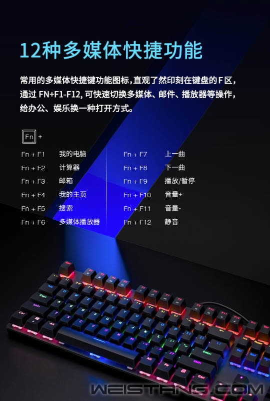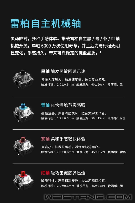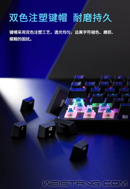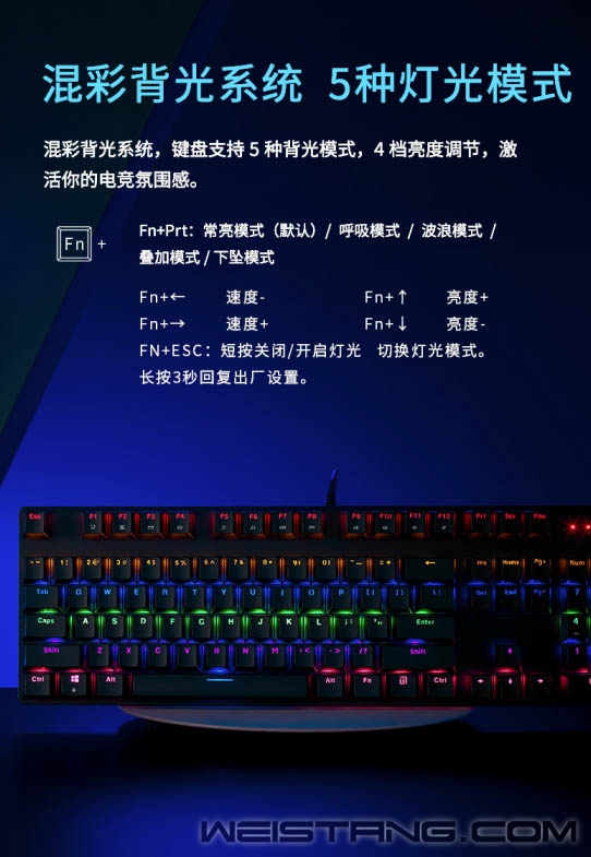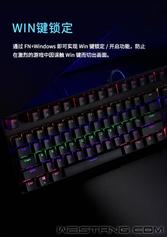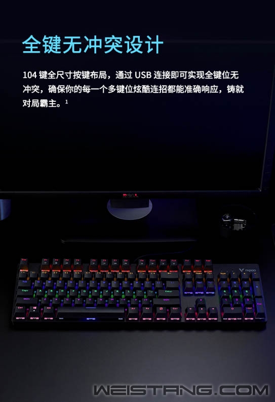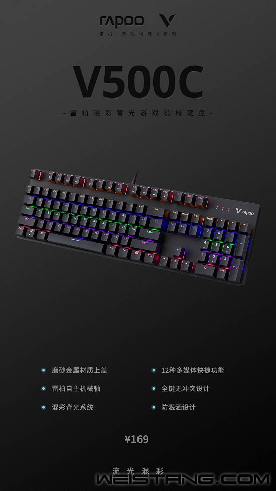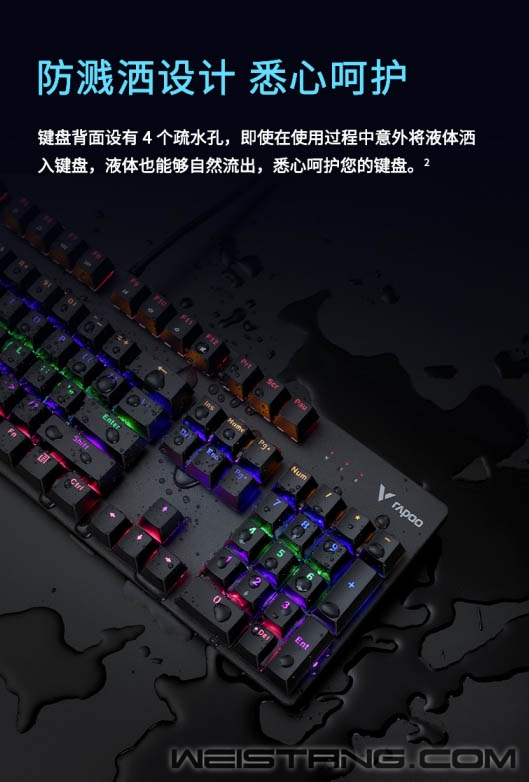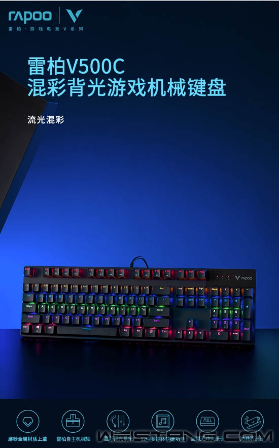 无光不电竞,一款带有炫酷灯光的游戏机械键盘怎么能少,Rapoo雷柏近日推出的V500C混彩背光游戏机械键盘,带着雷柏自主轴、全键无冲突设计、混彩背光系统,专为游戏玩家而来,接下来让我们一起看看吧。 键盘采取精选磨砂金属材质上盖,轴体与键帽整体悬浮于面板之上,方便日常清洁的同时,视觉上的细腻质感也不落于下风。 采用雷柏自主机械轴体,单轴6000万次使用寿命;黑、青、茶、红四种选择,满足不同使用人群游戏手感体验。 V500C带有混彩背光系统,5种背光模式,4挡亮度调节,满足每一个游戏夜晚的氛围体验。 换一种打开方式,让娱乐、办公更简单,通过FN+F1-F12组合键,可快速打开多媒体、邮件、播放器等操作。 双色注塑工艺的键帽,使得透光均匀,让字符褪色、磨损离你更远一点。 通过USB连接即可实现104全键位无冲突,让游戏里炫酷连招所需的每一个敲击,都能准确响应。 键盘背后设有4个疏水孔,保障意外将液体洒入键盘时可以自然流出,悉心呵护键盘。 精彩游戏,心无旁骛。通过FN+Windows即可实现Win键锁定/开启功能。无需为游戏对局中误触Win键切出画面而烦恼。 键盘背后不同角度的5个防滑脚垫,以及脚架处的防滑硅胶,灵活调节角度,让游戏激战时稳固不移。 |