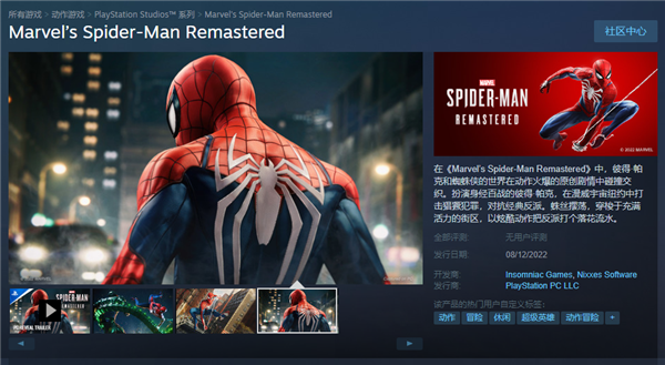 在此前索尼的“State Of Play”直播活动上,官方宣布,此前PS5独占的《漫威蜘蛛侠:复刻版》将在8月12日正式登陆PC平台。 今天,该作的Steam商店页正式上线,有兴趣的玩家可以搜索《Marvel’s Spider-Man Remastered》将游戏加入愿望单。 虽然商店页已经上线,但《漫威蜘蛛侠》PC版的配置要求和价格都暂未公布,从此前《新战神》、《地平线:零之曙光》等登陆PC的独占游戏来看,该作的售价大概也会在279元左右。 据此前官方介绍,该作登陆PC后将包括本体及3个全部DLC,PC版将支持可调节渲染设置和光线追踪反射等功能,画面效果更强。 《漫威蜘蛛侠》是由Insomniac Game制作、索尼发行的一款开放世界动作冒险游戏,游戏以曼哈顿作为蓝本,为玩家呈现了广阔的可探索空间。 在这座虚拟的曼哈顿,玩家将扮演蜘蛛侠,与绿魔”诺曼奥、夜魔侠“金并”等经典反派对抗。 |