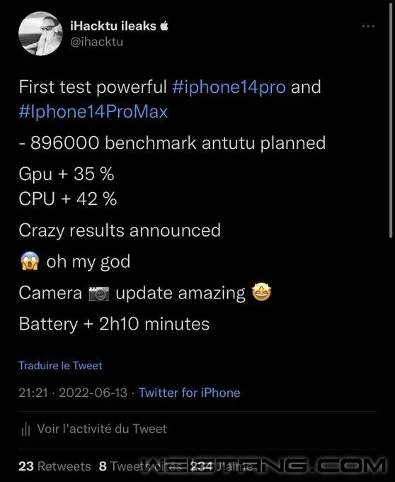 按照惯例,苹果将会在今年9月举办秋季新品发布会,届时iPhone 14系列新机将会正式与我们见面,据悉将会推出iPhone 14、iPhone 14 Max、iPhone 14 Pro与iPhone 14 Pro Max四款新机。 近日,有外媒爆料了有关iPhone 14 Pro手机的安兔兔跑分信息,综合成绩达896000分,相较于前代满血版的A15芯片,其CPU的综合性能将提升42%,GPU则提升35%,整体来说提升较大。 根据此前爆料的信息,iPhone 14系列将采用双版本芯片,即iPhone 14与iPhone 14 Max沿用iPhone 13 Pro同款5nm的A15满血版芯片,而iPhone 14 Pro与iPhone 14 Pro Max则会采用全新4nm的A16芯片。 另外,今年的iPhone 14系列将全系标配6GB RAM,不过采用A15芯片的iPhone 14与iPhone 14 Max仅支持LPDDR4X 2133MHz的内存规格,而采用A16芯片的两款Pro版则支持LPDDR5规格内存。 据悉,iPhone 14 Pro不仅在处理器上有所升级,在续航方面也有所提升,手机的电池续航时间与iPhone 13 Pro相比将会增加2小时10 分钟。 今年的iPhone很可能在外观、影像以及充电等方面均有着较大的改动,也是历年来苹果手机最大的一次升级。 |