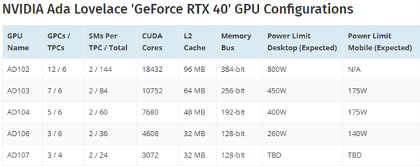 AMD Zen4锐龙、NVIDIA RTX 40系显卡、Intel 13代酷睿……下半年琳琅满目的硬件新品让DIY玩家期待不已。 关于RTX 40系显卡,爆料达人Kopite7kimi给出最新情报,这次有关功耗。 按照他的说法,RTX 40系主要核心的功耗极值设定如下: AD102:800W AD103(桌面)450W;AD102(笔记本)175W; AD104(桌面)400W;AD104(笔记本)175W; AD106(桌面)260W;AD106(笔记本)140W。 坦率来说,800W的功耗极值相当夸张,可见在摩尔定律放缓后,NVIDIA为了做到足够的性能增幅,不得不让位于高频率和高功耗这样暴力的提升手段。 当然,需要注意的是,功耗极值不等同于TDP(热设计功耗)或者TGP(整卡功耗),TDP和TGP通常会小很多。外界倾向于认为,AD102核心的RTX 4090 TGP会在500W以内。 |