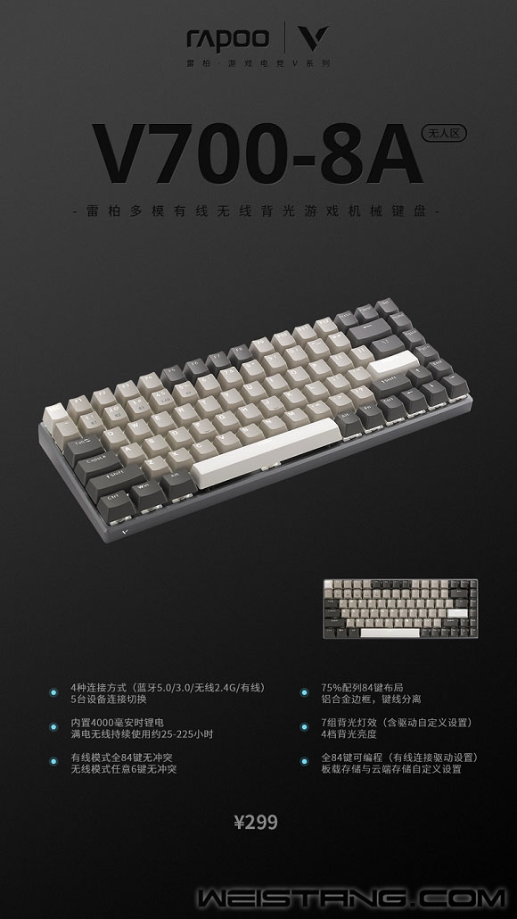 即将冲出无人之境,谁在呐喊? 在一望无垠的荒漠无人区,烈日当空,尘土拂面。75%配列、84键布局、多设备切换......似乎一个个符号背后都有无数种解读的可能。 作为一台性能“钢炮”,当它跑到沙漠,在余晖下扬起尘埃,雷柏V700-8A多模版无线游戏背光机械键盘,无人区版上市便是“野蛮”劲头的极佳契机! 与飞沙共舞的是其凌厉的身形,与戈壁共鸣的是铝合金边框带来的视觉刺激感官,喷砂氧化工艺,CNC切边增添了科技感,边框左下方V标重新诠释具有标识性的品牌风格,宣示着它的铁血硬汉作风。 白色背光又增添了许多神秘色彩,透光均匀的双色注塑键帽搭配纯白背光系统,4挡亮度调节,7组驱动背光灯效,支持自定义设置,在无人区里,叫嚣着潇洒和率性。 沙漠象征着对宁静、辽阔空间,无人区则是更自由舒展的状态。V700-8A无人区延续75%配列84键紧凑型键位布局,悬浮式按键,键线分离,防滑脚架,在兼容小尺寸的同时不失功能便利性;蓝牙5.0/蓝牙3.0、无线2.4G和有线四种连接模式,实现最多5台设备连接快速切换,Win系统下12种多媒体快捷功能,配合4000毫安时锂电,使用USB-C接口支持边充边用,满电量可带来至高225小时的持续使用时间; 以游戏性能体验为内核,以手感为运转力,精准捕捉每一个敲击指令;V700-8A无人区搭载雷柏自主黑、青、茶、红机械轴,6000万次单轴使用寿命,将拼搏凝练成风,将指尖敲出的每一步,铺成通往冠军之路;有线全键无冲、蓝牙/2.4G无线任意6键无冲,振刀、R闪、大跳身法各类连招,在漫漫黄沙中“摸爬滚打”,练就越野绝技,万军从中取敌方首级。 孤独,丰富,不绝对的答案。是游戏战场上的黑科技,亦是玩家互动的桥梁。有线模式下通过配套驱动软件,可实现84键独立编程,保存多组配置文件,在多场景中切换操作,登录V系列智能云存储,可将配置文件上传云共享,分享给其它玩家。 盘踞在干涸土地中的强悍生机,藏身于浩瀚沙漠中的坚韧不拔。无人区,以冲破黄沙的凌厉之势一同征服大漠。 雷柏75%配列键盘系列再添新成员,V700-8A无人区版多模式有线无线背光游戏机械键盘,在凌厉的身形下,隐藏着的正是磅礴动力。 |