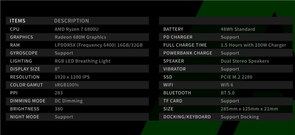 近日,AOKZOE宣布将在掌机上首发AMD锐龙7 6800U处理器,并预计在7月左右开启预售。 现在,这款掌机的详细配置已经正式公布。 从配置表能够看出,除了这颗锐龙7 6800U外,该掌机还将搭载16GB或32GB可选LPDDR5X-6400内存,以及M.2 2280规格SSD。 显示方面,该掌机搭载了一块8英寸1200P屏幕,拥有100%sRGB色域,300尼特亮度,支持DC调光。 其他方面,掌机的尺寸为285mm*125mm*21mm,内置45Wh电池,支持100W快充,约1.5小时即可充满。 在游戏的运行表现上,根据官方演示,在《极限竞速:地平线5》以1280*800P,低画质运行的情况下,这款掌机能够实现100fps以上流畅运行。 而在1280*800P,低画质选项下运行《艾尔登法环》,即便是在较为开阔的野外区域,也能够实现60fps的稳定运行。 |
