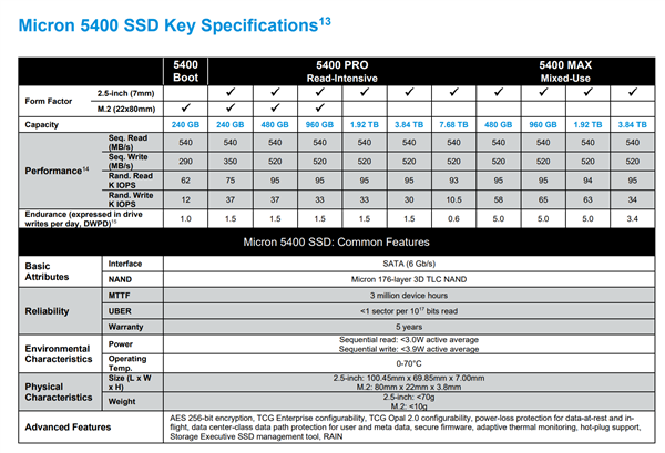虽然数据中心市场也开始大量使用PCIe硬盘,但是SATA接口的SSD容量上依然有优势,美光今天推出了全球首款使用176层TLC闪存的5400系列SSD硬盘,SATA 6Gbps接口,最大8TB容量,MTTF无故障时间高达300万小时,耐用性也比竞品高出50%。 美光的176层TLC闪存量产有一年多时间了,之前主要是在消费级SSD上使用,这次的5400系列是面向数据中心市场的,也是该市场上首款176层闪存的SSD,主要用于替代10000RPM转速的HDD硬盘。 这次的5400系列硬盘实际上分为三个系列,其中5400 boot只有240GB容量,是M.2规格的,主要用于启动盘,其他的5400 Pro及5400 Max才是SATA接口的,容量在240GB到8TB(实际为7.68TB)之间。 性能方面,SATA 6Gbps接口的速度就没什么好看的了,5400系列的读取速度可达540MB/s,写入速度在520MB/s,只有240GB容量的才会低至290MB/s、350MB/s。 随机性能也有一定差距,不过最主要的区别还是DWPD寿命,5400 Max系列最高可达5.0,也就是全盘每天最高5次写入,而寿命低的只有0.6DWPD,也就是每天0.6次全盘写入,但这是7.68TB容量的。 综合来看,美光表示5400系列SSD硬盘的可靠性比竞品高50%,数据寿命也高50%,还有5年保修,是数据中心替换HDD硬盘的理想选择。 |