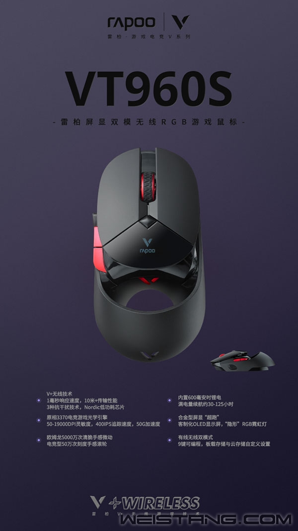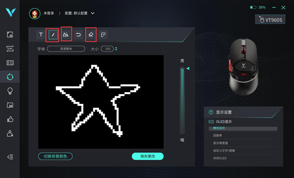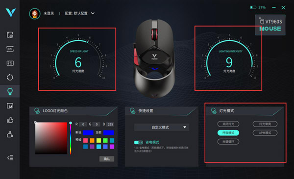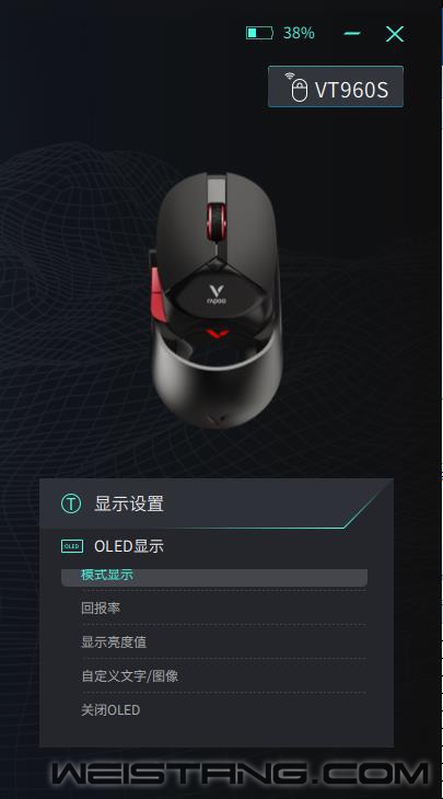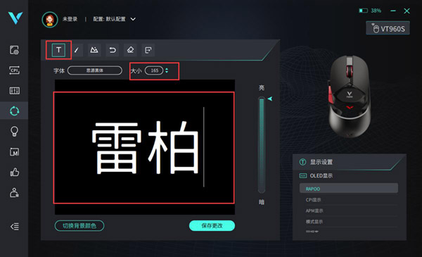 搭载着雷柏V+无线游戏技术,产品力、品牌力为一身的VT960S,在更低功耗、更远距离、更长续航、更强抗干扰的背后又以圆润、镂空的造型在业界掀起了一阵风潮。而在性能方面,旗舰级的原相3370光学引擎,OLED显示屏、9个可编程按键、板载储存等强悍配置,让你轻松拥有与顶尖高手较量的掌中利器。 与此同时,雷柏为VT960S配备了专属驱动,让你进一步挖掘VT960S的潜能,解锁更多玩法。今天,我们主要来了解下VT960S的隐形RGB背光和客制化OLED屏幕设置。 VT960S驱动使用: 打开已经安装好的雷柏VT960S鼠标驱动程序,在左侧菜单我们可以看到“配置设置“、”CPI设置“、”参数设置“、”OLED设置“、“灯光设置”、“宏编辑”、“支持”、以及云端存储自定义设置可上传的“个人中心”八个选项。需要说明的是,进行任何设置的调整与改变,大部分功能直接使用相关的动作,就能生效。这次主要讲解的是“配置设置“、”CPI设置“、”参数设置“、“宏编辑”、“支持”、以及云端存储自定义设置可上传的“个人中心”。 OLED设置: 在驱动的左边一栏里有OLED设置,在这个选项里,我们可以对OLED屏幕实现手画、文字以及图片进行自定义设置。 文字编辑 点击OLED显示框里的【T】便可进入文字模式,我们可以通过输入你想要显示的内容,最后在鼠标上的64*68像素的屏幕里呈现。字体可以调节大小(55-165号)。调整字体时,输入的文字会实时调整,记得文字不要溢出边框即可。 当然还可以定制你的专属鼠标,我们可以通过VT960S的文字显示,定制你的中文及英文名,打造你的专属名片,你的战鼠你做主,横扫千军,谁与争锋。左下角有一个“切换背景”的按键,这个功能是可以让你的屏幕在黑底与白底之间来回随机切换,当我们选中“切换背景”这个选项时,当前的OLED显示屏则是白底黑字,反之则是黑底白字。 此外在OLED右边的显示设置页面中,有默认八种模式供用户选择,如CPI显示,回报率显示,关闭OLED等,满足不同用户的需求。 画图、导入图片自定义 有一个画笔图案的,就是涂鸦功能了,可以自己画想要展示的图形。同时,驱动也支持上传bmp图片,手残党的福音哈。 灯光设置 VT960S的隐形RGB Logo灯拥有1680万色的RGB背光系统,使光线透出更为纯净均匀,不漏光。在驱动【灯光设置】页面中,可以对VT960S品牌 Logo灯部分进行颜色自定义设置,有【LOGO灯光颜色】、【快捷设置】以及【灯光模式】三处设置。 快捷设置 我们在这个模式下,一共有四种灯光模式可供设置,分别是“炫酷模式”、“均衡模式”、“节能模式”以及“自定义模式”,并且下面还有一个省电模式【其作用是在无线模式下,移动鼠标时会关闭OLED显示屏以及灯光】,默认均衡,节能,自定义模式是打开省电模式。 灯光模式 我们可以设置的灯光模式分别有:光谱循环、APM模式、呼吸模式、灯光常亮以及关闭灯光。此外在呼吸模式,光谱循环模式下,可以自行调节灯光亮度以及速度;在灯光常亮模式,APM模式下,可以调节灯光亮度。 LOGO灯光颜色自定义 默认有10种预设配色,可以通过三原色“Red”、“Green”、“Blue”调节按钮或者最左侧的调色光圈进行自定义选择,选择的颜色会反映在【当前使用颜色】小模块上。 |