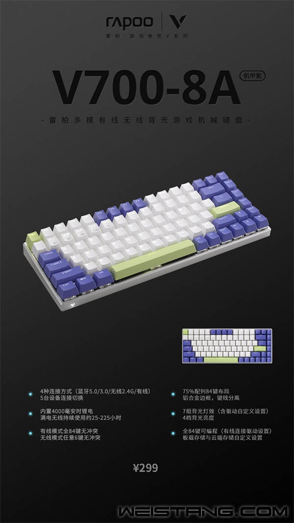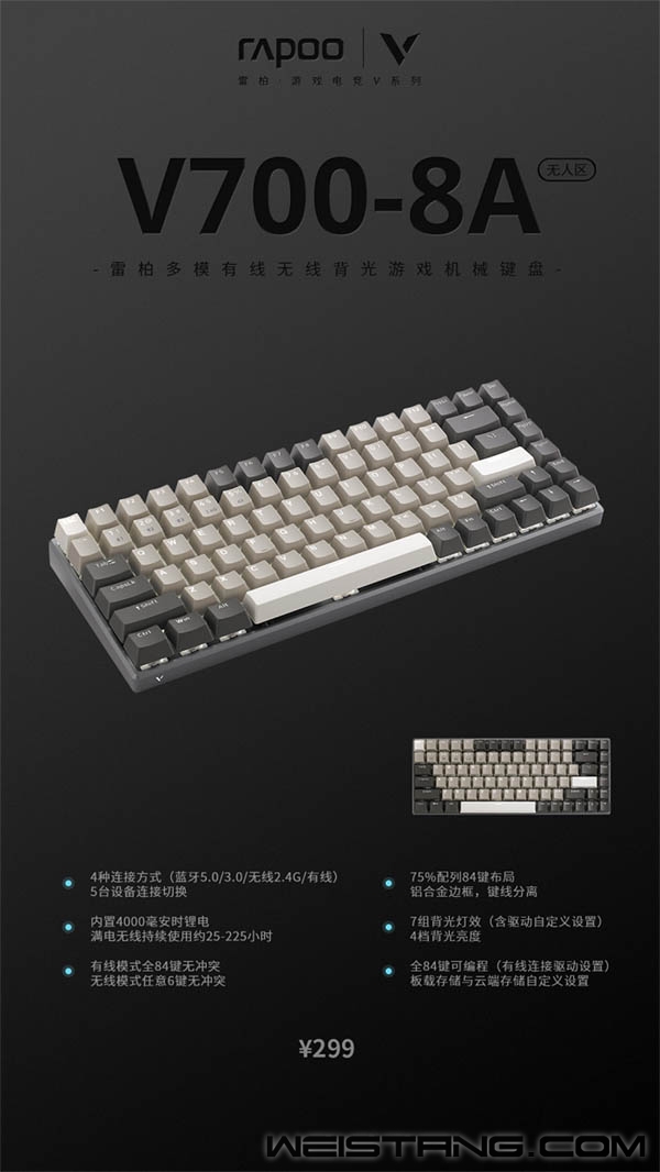 当一个小的“我”走进大的“我们”时,该如何在个性与共性之中权衡?近日rapoo雷柏推出了V700-8A多模式有线无线背光游戏机械键盘系列,不必各占一边,寻找这一平衡,融入个性于共性。 孤城暮角下的孤勇者;一望无垠的荒漠无人区;破次元的星球机甲紫。各款不同色系属性搭配,宣示各不相同的“竞技”意识,在属于自己的游戏维度里个性凛然,一尘绝迹。 是来自V700-8A强于强之间相遇的共性。75%配列键盘,84键布局;蓝牙5.0/蓝牙3.0、无线2.4G和有线四种连接模式加持无线游戏场景,空间高度灵活的变化属性,多设备快速切换,契合当下年轻一代对多场景切换及多元化身份的需求;4000毫安时锂电提供源动力,使用USB-C接口支持边充边用,满电量带来至高225小时持续使用时间;带有自然力量的单品,更多变,更持久。 野性的嗅觉下秉持着硬汉属性,铝合金边框与CNC切边增添科技感,边框左下方V标带来视觉刺激感官。透光均匀的双色注塑键帽搭配纯白背光系统,4档亮度调节,7组驱动背光灯效,支持自定义设置,在现实世界里,洒脱与灵动并存,个性与共性同在! 实力共享,与强为伴。有线模式下通过配套驱动软件,可实现84键独立编程,保存多组配置文件,在多场景中切换操作,登录V系列智能云存储,可将配置文件上传云共享,分享给其它玩家。接收这一份版本新答案! |