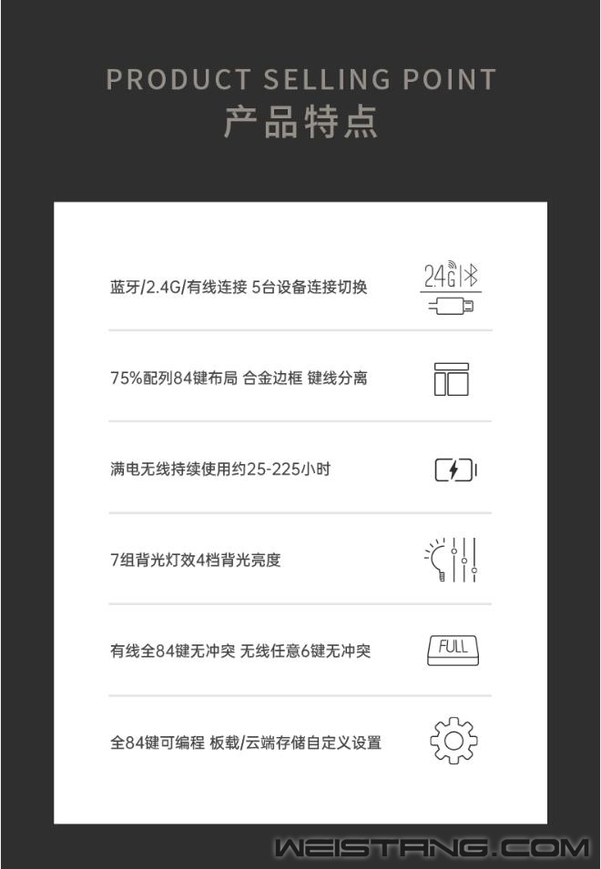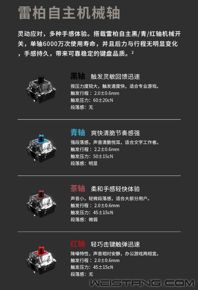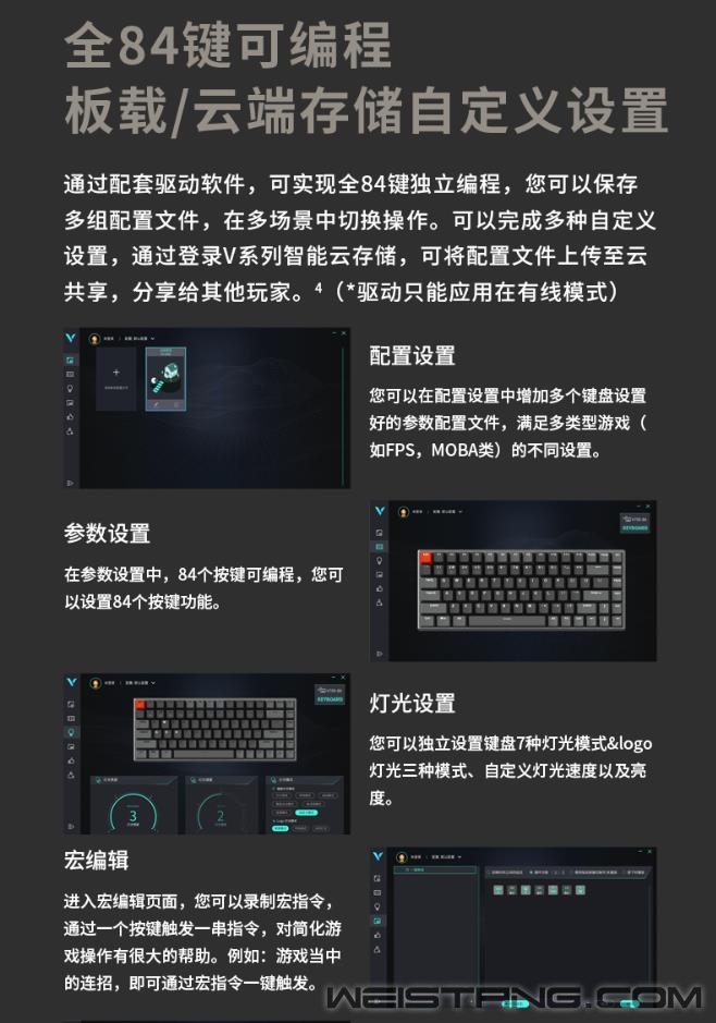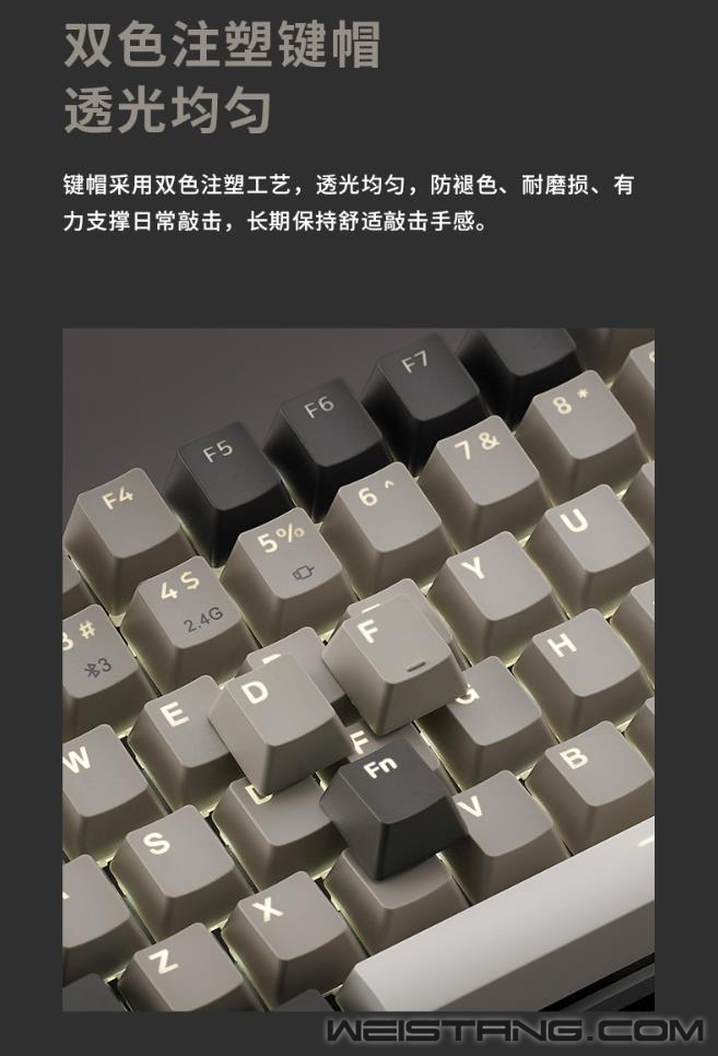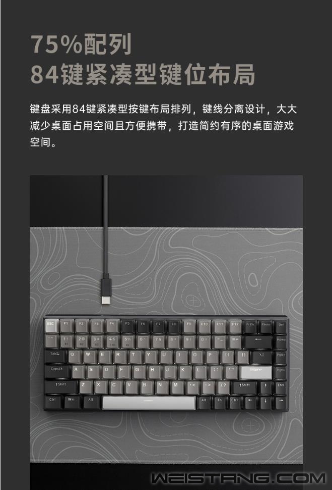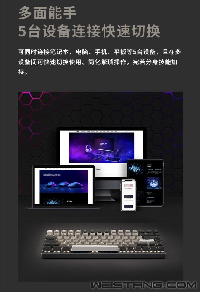 近日,领军国产外设品牌,实力大厂上市企业Rapoo雷柏,推出了V700-8A无人区多模式有线无线背光游戏机械键盘。首款75%配列84键的紧凑型键位布局,蓝牙5.0、蓝牙3.0、无线2.4G和有线四种模式,最多支持5台设备连接切换,雷柏自主黑青茶红游戏轴体,实现有线全键无冲,无线任意6键无冲,内置4000mAh的锂电池,支持边充边使用,为你的桌面打造极简有序的游戏空间。 无人区,散去繁华波澜,宛若沙漠里一切不过寂静荒芜,浩瀚无垠的表面里暗藏肃穆危机,造就至佳之境。 蓝牙5.0、蓝牙3.0、无线2.4G和有线四种连接模式,低功耗、低延迟、高效率,尽享游戏狂欢盛宴。并且可同时连接笔记本、电脑、手机等5台设备,多设备间可切换使用,多面能手,化繁为简。 75%配列,84键紧凑型的键位布局作为V700-8A无人区的特点之一,键线分离的设计,大大减少了桌面的占用空间且方便携带,打造简约有序的桌面游戏空间。 悬浮式的按键与喷砂氧化工艺铝合金边框的相互碰撞也是无人区的一大亮点之一,辅以机身四周边缘苹果风格的高速CNC切边工艺,键身前处的品牌V系列logo,质感不凡,令人一见倾心爱不释手。 雷柏自主机械轴,经过几代产品更新,已成为高质量国产轴的代表,黑、青、茶、红四款经典轴体的特色已无需多言,任君所好;6000万次寿命,确保手感持久不变;镭雕技术键帽,字符清晰耐磨,带你体验最原汁原味的机械轴手感。 V700-8A无人区内置4000mAh高能锂电,配合雷柏的低功耗芯片与节能省电技术,满电无线持续使用25-225小时,续航时长可达约1周到2个月,免去频繁充电的麻烦。 键盘采用纯白背光系统,支持7种背光模式,4档亮度调节,并通过驱动还可自定义设置以及logo灯光,兼备优雅的气韵与凛然耀目的视觉盛宴。 键盘在有线模式下能实现全键无冲突,在蓝牙和2.4G模式下,支持任意6键同时输入。快速触发,始终比别人快一步,稳操胜券。 通过键盘配套的驱动软件,可实现84键独立编程,您可以保存多组配置文件,在多场景中切换操作。可以完成多种自定义设置,通过登录V系列智能云储存,可将配置文件上传至云共享,分享给其他玩家。 键盘拥有12个Win系统多媒体快捷键,方便快速切换邮件、浏览器、多媒体播放等操作。 键帽采用双色注塑工艺,透光均匀,防褪色、耐磨损、有力支撑日常敲击,长期保持舒适敲击手感。 键盘采用人体工学设计,背面设有硅胶脚架与防滑脚垫,可灵活调节使用角度的同时,在光滑的桌面上使用,亦能稳固十足,让你在激烈游戏时心无旁骛。 |