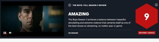 亚马逊热播反超英雄剧集《黑袍纠察队》第三季在不久前迎来季终集,今日IGN发布了对整个第三季的评分——9分。评测编辑盛赞了这个系列一贯的劲爆情节,同时也为祖国人和屠夫等角色的演员贡献的精彩表演点赞,这一季令《黑袍》更上一层楼。 评分:9惊艳 《黑袍纠察队》第三季在有力的叙事和刻画极端劲爆桥段之间取得了平衡,作为史上最优秀流媒体剧集之一,这一季捍卫了自己的荣誉。 总评: 《黑袍纠察队》简直势不可挡,制片人艾力克·克莱普科在反套路娱乐、社会问题和严肃态度上取得了很好的平衡。安东尼·斯塔尔(饰 祖国人)和卡尔·厄本(饰 屠夫)的合作令本剧在表演层面上媲美如今任何剧集,因为第三季更注重戏剧冲突,在怪诞的情节上稍稍减缓用力。鉴于第三季如此高的质量,让人等不及第四季出来再继续狂追。毫无疑问,《黑袍纠察队》是最优秀的流媒体剧集之一。 在完整文章中评测编辑特别赞赏了安东尼·斯塔尔的演技,第三季他把祖国人演活了,在镜子前完美演绎出一个自大又充满恐惧的精神分裂形象,不拿艾美奖简直说不过去。 剧集剧照: |