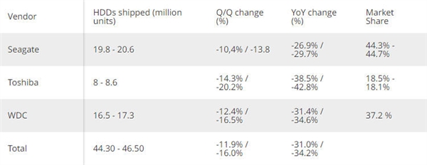 选SSD硬盘还是HDD机械硬盘?这对个人消费者来说完全不用考虑了,而且微软明年都要强制系统盘使用SSD硬盘,机械硬盘更没多少人买了,最新统计显示Q2季度出货量不过4650万部,这还不到2010年季度出货的零头。 据报道,2022年Q2季度的机械硬盘报告出来了,希捷、西数及东芝三大厂商的出货量自然进一步下滑,第一大厂商希捷出货量在1980到2060万部左右,同比暴跌30%左右。 西数出货量在1650到1730万部之间,东芝出货量在800到860万部之间,同比都跌了30-40%以上。 三家合计出货量约为4430到4650万部左右,同比暴跌30%以上。 这个数据有什么意义?在2011泰国洪水、日本地震之前,全球机械硬盘的出货量巅峰是2010年的6.51亿部,每季度大约1.63亿部,现在的季度出货量都不到之前的零头,年度出货量直接暴跌了5亿部,市场空间萎缩太多了。 |