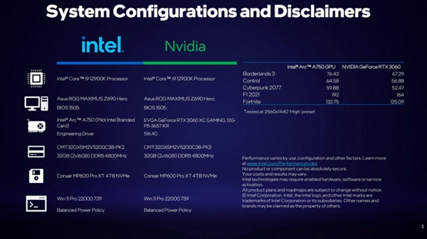 在Arc A380独显之后,Intel的游戏卡还会在夏季再来一波,这次终于有高端显卡了,这几天预热了A750显卡,Intel官方更是直接公布了A750显卡的性能,2K分辨率性能比RTX 3060显卡高出17%之多。 Intel显卡部门营销负责人Ryan Shrout公布了A750显卡的性能测试,对比的是NVIDIA的RTX 3060,跑了F1 2021、赛博朋克 2077、Control、Borderlands 和 Fortnite这五款游戏,分辨率是2560x1440,高画质。 在这几款游戏中,A750领先最少的也有6%,最多的是在F1 2021游戏中,优势高达17%。 具体的帧数上,赛博朋克 2077这样的游戏可以跑到60帧,其他游戏也在60帧以上,最高的F1 2022可以跑到192帧。 当然,5款游戏总体来说还是有点少,不过Intel现在展示的A750性能可以证明它确实可以超越RTX 3060,但是考虑到之前A380显卡的真实表现,A750最终能够超过RTX 3060就先打个问号。 Intel也没有公布A750显卡的具体规格,不过之前的爆料显示,它拥有24个Xe内核,搭配192-bit 12GB GDDR6显存,在往上还有Arc A770,拥有满血的32个Xe内核、256-bit 16GB GDDR6显存,性能预计类似RTX 3070。 |