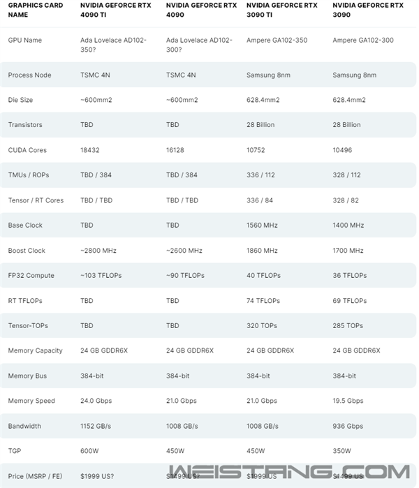 NVIDIA已经是铁了心地在清RTX 30系显卡库存,这似乎是下一代显卡整装待发的强烈信号。 一个新的证据是,硬件神器AIDA64首次加入了对GeForce RTX 4090的识别支持,并确认其采用名为AD102的GPU核心。这似乎证明,RTX 4090已进入紧锣密鼓的测试阶段了,恐怕很快也会有相关GPU信息截图流出。 据悉,AIDA64 6.70.6033 BETA版这次的步伐比GPU-Z还早,还特别提到RTX 4090的PCI ID显示为“NVIDIA_DEV.2684”。 按照现有爆料,RTX 4090基于AD102-300核心打造,打开了144组完整SM单元中的128组,也就是对应16384个CUDA,集成96MB L2、384个ROP、24GB GDDR6X显存(21Gbps、384bit)。核心采用台积电4nm工艺制造,频率2~3GHz,整卡功耗450W,单16Pin外接供电。 性能方面,传言单精度浮点可以达到70~90T区间,比RTX 3090 Ti的40T翻番,游戏方面,平均性能提升50%以上、光追提升一倍以上。 至于发布事件,MLID给出的最新说法是定档10月份,且首发的只是RTX 4090。 |