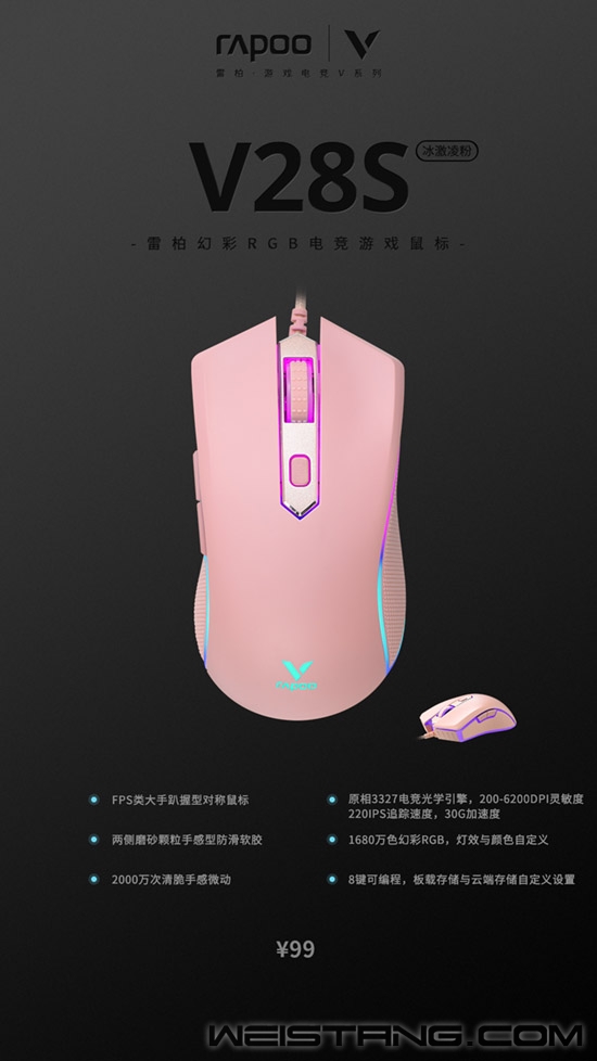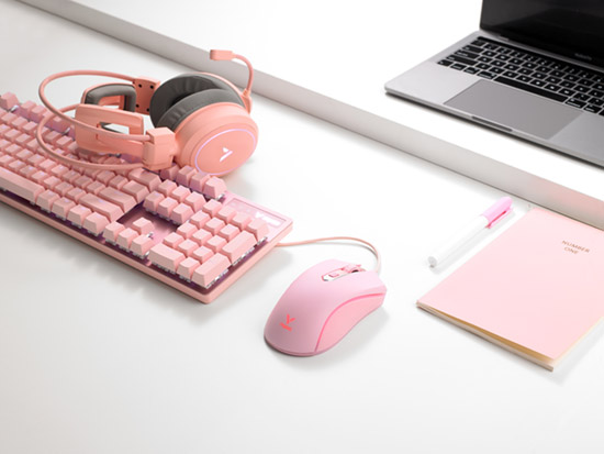 连接游戏,核心玩法、战斗属性、视觉特效等层出不断,多样化的主题、版本更新迭代愈发频繁,视觉体验刺激情绪神经;回归现实视觉体验依旧在线。 全新冰激凌粉配色,清爽粉嫩增添活力,约1680万色幻彩背光,现实中依旧能够连接炫彩引线,左右手对称人体工学、8键可编程,带有板载内存;雷柏V28S幻彩RGB电竞游戏鼠标冰激凌粉版上市! VH610虚拟7.1声道游戏耳机、V500PRO游戏背光机械键盘,雷柏冰激凌粉电竞游戏外设V系列全家桶上线,展现粉色缤纷态度! 清爽细腻的冰激凌粉配色,注入桌面场景,唤醒视觉活力;连接游戏世界,虚拟粉色系游戏少女初登场;搭配V28S约1680万色幻彩RGB背光的苏醒,甜稠柔和的外表下增添一份炫酷的战斗气场,曙光初照团战场,飒爽英姿粉红装。 够强的性能是开战的号角,V28S采用左右手对称人体工学,流线外形、左右一体式成型全包胶侧裙,点状纹理,饱满的贴合手型手掌,更好的掌控战场主导;内核搭载原相3327电竞光学传感器,共有400/800/1200/1600/2400/3200/6200七档DPI可调节,支持自定义;迅速找到属于自己的手感时刻,击溃敌军。搭配专属驱动,8键可编程与2000万次微动清脆微动开关,化繁为简、手感持续才是制胜的秘籍。粉嫩的外表内蕴藏野性的嗅觉,性能的溢出让操作时刻拉满! 装备配套,同频共振,一嗨到底;搭配雷柏V500PRO冰激凌粉背光游戏机械键盘、VH610清滢粉虚拟7.1声道游戏耳机;当桌面场景被粉色占领,视觉神经迎接挑战,这局来自桌面场景化的团战,一触即发,你准备好了吗? |