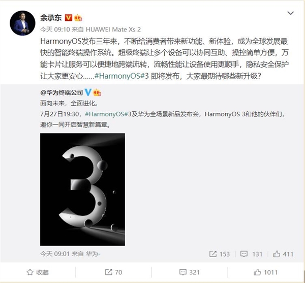 今天,微博话题”华为将发布HarmonyOS 3“冲上热搜榜。据悉,华为将于7月27日发布HarmonyOS 3。 华为余承东表示,HarmonyOS发布三年来,不断给消费者带来新功能、新体验,成为全球发展最快的智能终端操作系统。超级终端让多个设备可以协同互助、操控简单方便,万能卡片让服务可以便捷地跨端流转,流畅性能让设备使用更顺手,隐私安全保护让大家更安心。 结合此前爆料的信息,华为HarmonyOS 3提升了设备与设备之间的交互体验,同时因为新的算法加入,所以HarmonyOS 3在日常使用时比2.0版本更加流畅,多设备流转很可能会下放更多机型。 除了上述的细节更新,HarmonyOS 3支持更多设备接入,只要是HarmonyOS 3系统的设备,那么就可以进行设备与设备之间的相互接入。 比如HarmonyOS电脑的键盘可以接入到华为手机上使用;或者是HarmonyOS的显示器接入到HarmonyOS的电子秤上,那么就可以显示相应的信息。 值得注意的是,这次新品发布会除了HarmonyOS 3之外还有智能设备将会同台亮相,7月27日我们拭目以待。 |