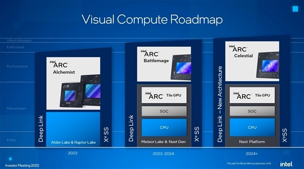 从1998年推出i740独显算起,Intel在24年后再次杀入了游戏卡市场,推出了Arc锐炫品牌及多款A系列显卡,不过第一代的显卡并不追求跟AMD、NVIDIA全面开战,这些显卡最主要的对手可能到RTX 3060级别而已。 Intel官方已经否认了A780显卡的存在,目前来看这一代的Arc A系列显卡主要就是5款—A310、A380、A580、A750及A770,此前我们汇总过这五款显卡的规格及价格: A310定位入门级游戏卡,4GB显存、75W以内功耗,对标GTX 1050/Ti显卡,售价在99美元内。 A380显卡对标的是GTX 1650,6GB显存,75W功耗,售价在100-149美元,国内首发的就是这个,国行价格是1030元。 A550对标的是RTX 3050,略高于AMD的RX 6500 XT,8GB显存,175功耗,售价在200-299美元。 A750显卡对标的是RTX 3060、RX 6600 XT,8GB显存,225W功耗,售价在300-399美元。 A770是Intel的旗舰了,不过定位也只是比A750高一点点,对标的是RTX 3060 Ti或者RX 6650 XT显卡,价格也是在300-399美元左右。 旗舰A770显卡的性能没有公布,但是之前Intel官方透露了A750显卡的游戏性能,5款热门游戏中,A750领先最少的也有6%,最多的是在F1 2021游戏中,优势高达17%。 A770显卡的性能理论上还要高30%左右,对标RTX 3070显卡也是有可能的,不过跑分是一回事,实际游戏中因为种种原因可能会打折扣,综合来看Intel这代Arc显卡能够超过RTX 3060就是赢了。 毕竟泄露出来的价格也显示A770显卡最高价格也就是399美元档次的,人民币折合2700元左右。 当然,这也只是第一代Arc显卡的情况,这代的架构代号Alchemist(炼金术师),后面还有两代显卡已经规划好了,第二代的Battlemage将在2023-2024年发布,采用Tile GPU设计,搭档未来两代酷睿处理器。 第三代的Celestial将首次进入超级发烧友市场,架构研发工作已经正式开始,2024年后发布,搭档再下一代酷睿。 |