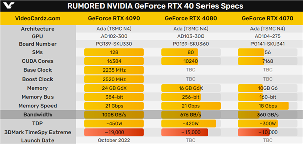 相比于平静如水的AMD RX 7000系列,NVIDIA RTX 40系列可谓猛料不断,各种说法满天飞。 今天,硬件曝料高手kopite7kimi带来了RTX 4090、RTX 4080、RTX 4070的跑分性能,当然不是真的测试,是根据已掌握规格参数的预期。 按照他的说法,3DMark Time Spy Extreme测试中,RTX 4090、RTX 4080、RTX 4070可以分别得到超过1.9万分、超过1.5万分、大约1.0万分。 这都是什么档次?RTX 4090已经比RTX 3090 Ti高出多达66%,RTX 4080几乎是RTX 3080的两倍,RTX 4070则几乎相当于RTX 3090或者说RX 6900 XT! 不过,RTX 40系列的发布节奏依然成谜,有的说今年就一款RTX 4090,也有的说今年会上RTX 4090、RTX 4080。 |