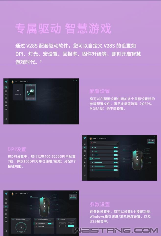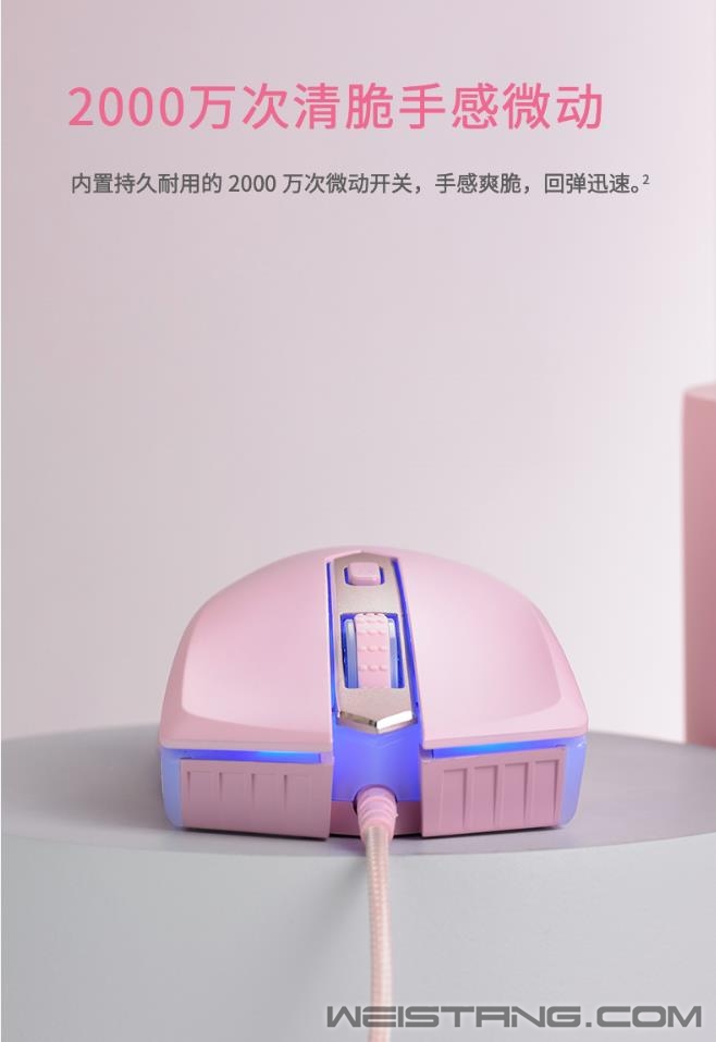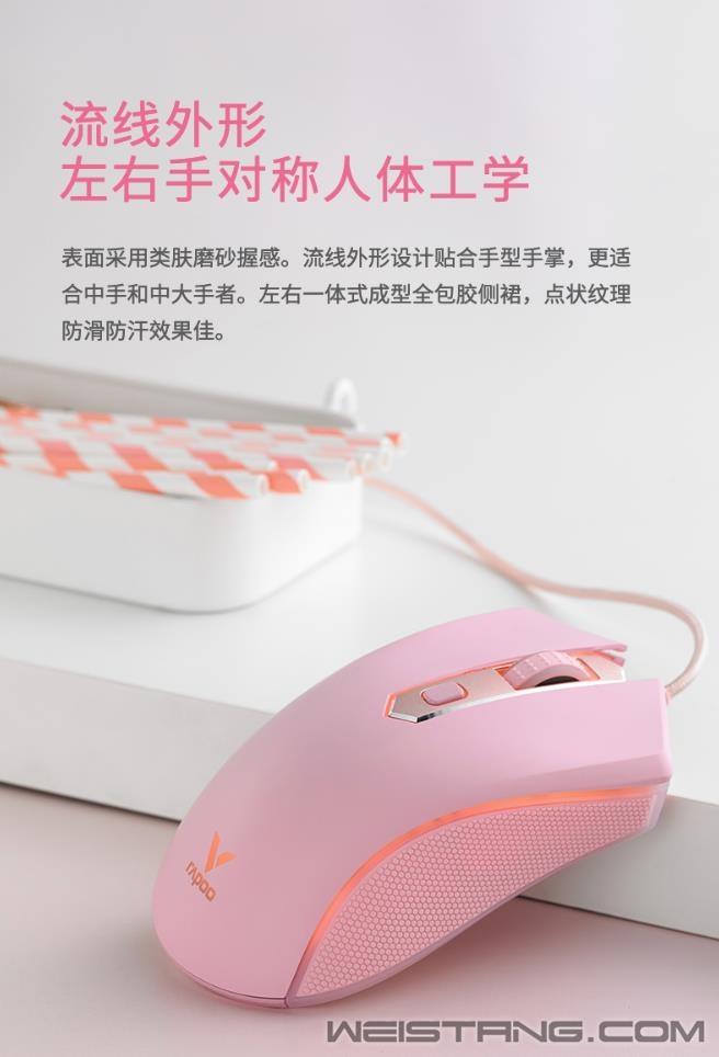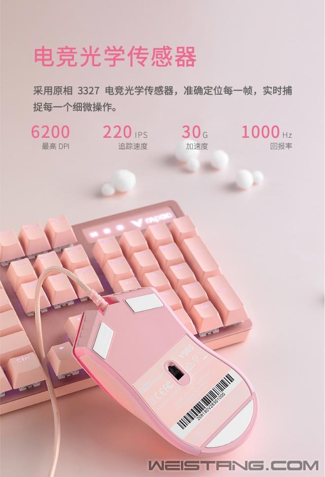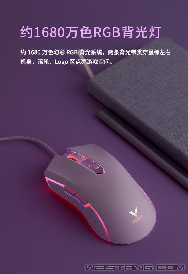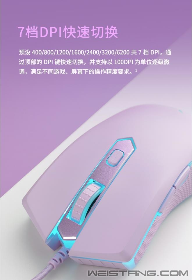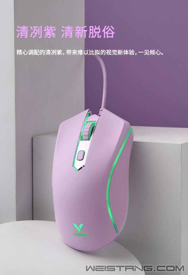 领军国产外设品牌,实力大厂上市企业Rapoo雷柏推出V28S幻彩RGB电竞游戏鼠标清冽紫&冰激凌粉,专为电竞玩家打造。使用了原相3327电竞光学传感器,准确定位每一帧。7档DPI,8个可编程按键,化繁为简。适合FPS类大手趴握型对称鼠标,1680万色的RGB背光系统,点亮属于自己的游戏空间。接下来让我们一起来看看这两款彩色款游戏鼠标的表现吧。 V28S彩色款共有两个颜色可供选择,可爱俏皮的冰激凌粉,细腻柔和,增添活力,萌生心动。 精心调节的清新脱俗清冽紫,带来难以比拟的视觉新体验,一见倾心。 V28S表面采用类肤磨砂握感,流线外形的设计贴合手型手掌,更适合中手和中大手着。左右一体式成型全包胶侧裙,点状纹理防滑防汗效果佳。 采用约1680万色幻彩RGB背光系统,两条背光带贯穿鼠标左右机身,滚轮、logo区点亮游戏空间。 鼠标采用原相3327电竞光学传感器,预设多达7档的DPI,最高6200DPI通过顶部的DPI键快速切换,并支持以100DPI为单位的逐级微调,220IPS的追踪速度,30G的加速度,1000Hz的回报率,准确定位每一帧,实时捕捉每一个细微操作。 内置flash存储器,通过V28S的专属驱动,可自定义鼠标8个按键的功能,如快捷功能、宏设置等,化繁为简,快乐游戏。还可自定义V28S的多种设置,如DPI、灯光、宏设置等,即刻开启智慧游戏时代。 鼠标内置持久耐用的2000万次微动开关,手感爽脆,回弹迅速。底部采用3块特氟龙材质脚垫,让你顺畅滑动鼠标,掌控在心。 |
