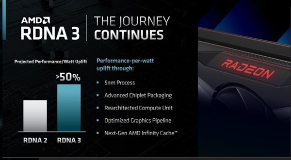 除了锐龙7000处理器之外,AMD今年还会有一款重磅显卡新品——RX 7000系列,也是5nm工艺的,升级全新的RNDA3架构,AMD确认年底前上市,要跟RTX 40系列竞争。 RX 7000系列显卡的爆料没有NVIDIA的RTX 40系列那么频繁,AMD官方确认的信息很少,主要是能效在RDNA2基础上再次提升50%,用上全新的架构、小芯片封装及无限缓存等设计。 那RDNA3的能效到底如何?测试软件CapFrameX的作者爆料称,他得到了一些消息,认为RNDNA3的能效这一波真的起来了,足够“踢NVIDIA的屁股”,这是个俚语,用我们理解的话说就是够让NVIDIA喝一壶的,很强就是了。 当然,传闻归传闻,现在不能100%确认。 不过这也不是传出RDNA3显卡架构能效可以领先NVIDIA了,今年4月份就有消息提到了这一点,AMD对自己的能效也很自信,毕竟现在的GPU研发已经由华裔大牛David Wang主导了,他之前可是GCN架构的缔造者之一。 根据之前的爆料,RX 7000系列显卡的GPU核心模块GCD是5nm工艺,最多15360个核心,搭配最多6组MCD核心,最多384bit位宽,192MB或者384MB无限缓存,浮点性能可达90TFLOPS,跟NVIDIA下代的RTX 40大核心AD102的性能在伯仲之间,都是相比上代旗舰提升2倍以上的性能,代价当然是功耗也冲上了400W甚至500W级别。 |