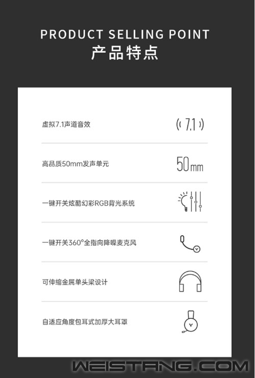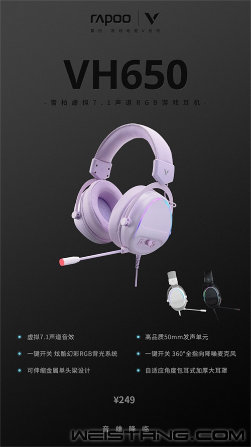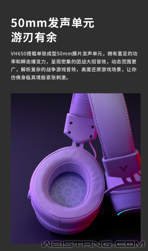 一款带有高效性能的耳机可以帮助玩家在游戏中叱咤四方,而配色则可以助力玩家视觉更好体验,VH650星辰白配色唤新上市~熟悉的虚拟7.1声道音效、50mm发声单元,一键开关炫酷幻彩RGB背光系统。简约时尚的星辰白,接下来让我们一起来详细了解一下! VH650通过驱动软件可开启虚拟7.1声道音效,营造更真实的环境音层次感,加上单张成型的50mm膜片发声单元,拥有富足的功率和瞬态爆发力,解析复杂的战争游戏音效,两者配合使得音效真实还原,枪战游戏时,通过声效清晰反应脚步声、枪声的方位,仿佛身临其境,游戏沉浸感直线拉满。 高灵敏全指向降噪麦克风,可360°自由调节,有效抑制环境噪音,和队友语音沟通时纯粹清晰,指挥全场。搭配多功能耳壳操控设计,集成音量调节、麦克风开关、背光开关三种功能,在游戏中通过指尖之间轻松控制,方便好找,伸手即控,省时省心。 耳机有着三款不同配色任君选择,可甜可飒的迷雾紫、暗藏玄机的暗夜黑,舒适简约的星辰白;配合着耳罩环状RGB灯带,潮色涌动,至炫至酷,在黑夜中点亮专属于你的电竞色彩,电竞氛围拉满,打造沉浸式的游戏环境。 金属可伸缩单头梁,韩范头戴设计,可靠耐用,两侧可伸缩调节长度,适应不同头型大小。头梁顶部采用约2cm的厚高密度耐水解皮质海绵,防水耐汗透气,减少佩戴时的压迫感。配合可智能左右调节大尺寸柔软双耳罩,触感柔软细腻的加厚耐水解皮质海绵,全包耳式的包裹效果,有效降低环境噪音的同时,佩戴持久游戏亦能舒适自如。 |