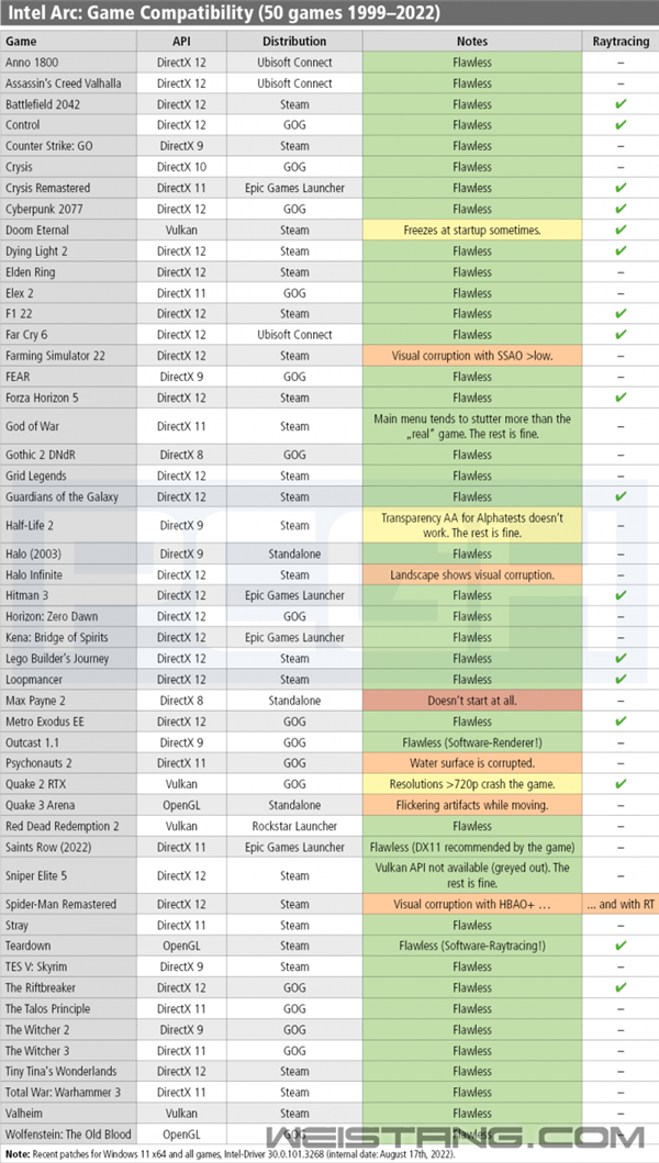 今年早些时候,Intel发布了入门级独显锐炫A380,现在,这块显卡的兼容性测试结果终于出炉。 根据PC Games Hardware的测试结果,在覆盖了1999年到2022年共计50款游戏的兼容性测试中,A380取得了整体来说较好的成绩。 从测试结果来看,A380能够运行近年发售的所有测试游戏,且部分年代久远,使用DX8/9/11的游戏也能够顺利运行。 但是,也有类似《马克思·佩恩2》(2003年发售)这样的老游戏,在A380上会出现完全无法运行的情况,这值得钟爱经典游戏的玩家注意。 值得一提的是,在本月中旬,Intel曾宣布,将原生DX9支持从自家独显与集显中移除,转而使用DX12的仿真模式运行。 这种通过API转译的技术,本身就容易在老游戏的兼容适配上出现问题。 |