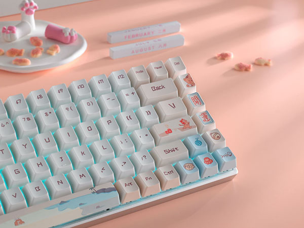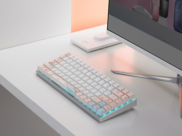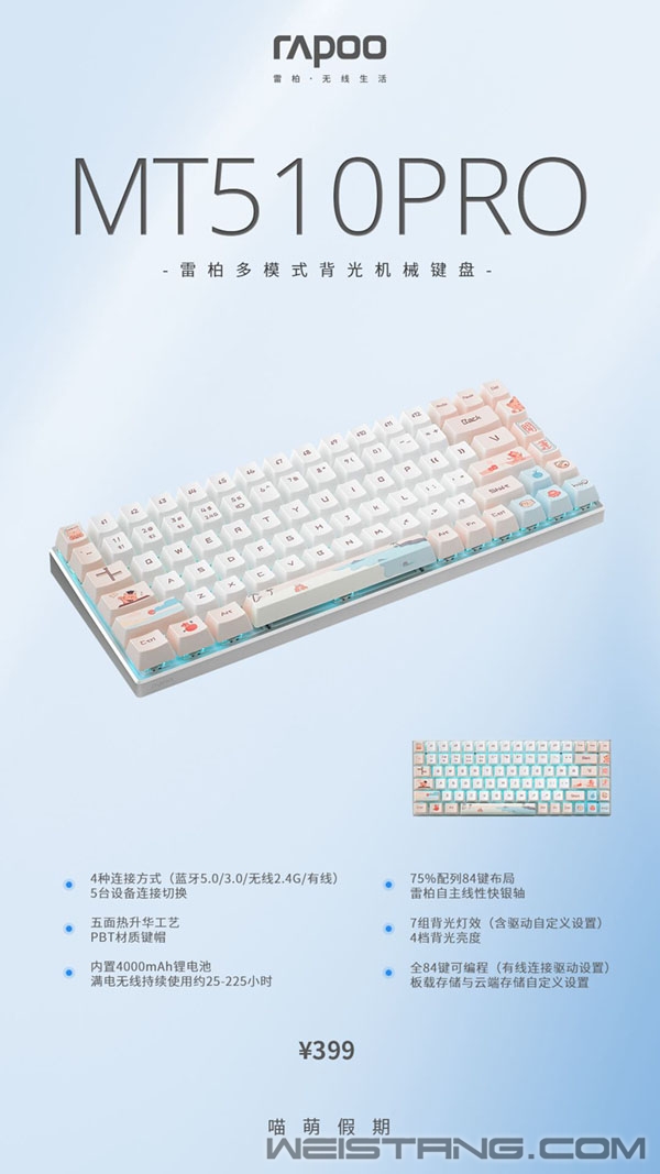 MT,雷柏高端商务办公系列。该系列诞生于对设计、现代性办公与无线桌面的热爱。2022年,把治愈、色彩、触感做语言,延续MT简约标志性设计,推出特别主题版本,雷柏MT510PRO多模式背光机械键盘喵萌假期上市。 搭载雷柏全新自主轴体---线性快银轴,短键程,提升了触发信号,跟手感强。缓解奔走于无暇顾己的繁忙都市时的压力,惬意悠闲的触感反馈,无线蓝牙多模连接切换,消散疲惫,活力满满应对不同挑战。 精工细作,大饱眼福 萌趣体验,轻触开启。从日出到沙滩、从好吃到好玩、从学霸形象到玩乐主义,MT510PRO喵萌假期以细腻精巧的图案设计刻画不同时序、活灵活现的喵萌假期记忆,展现一种劳逸结合的舒适状态,键帽配色取橘喵的黄白花纹作为配色灵感,轻触时,恰到好处的萌趣倾然而来。 75%配列,84键位紧凑布局设计,轻松打造简约而有序的办公桌面,将商务办公腔调拉到了更高的阈值。悬浮式的按键设计,喷砂氧化工艺铝合金边框,辅以机身的CNC切边工艺,使其拥有更高质感辨识度,为商务办公生活注入了鲜明的风格及态度。冰蓝背光系统,7组背光灯效,4档亮度可调节,兼备优雅气韵与凛然耀目的视觉。 感触细腻,续写经典 舒适利器,感触细腻。MT510PRO喵萌假期采用五面热升华工艺的PBT材质键帽,字符颜色鲜亮,手感亦更细腻,为我们避免字符褪色磨损、打油等困扰。键帽还采用了基于人体工程学设计而精致打磨的线条与弧度的OEM高度阶梯式设计,与人手敲击键盘的运动弧线更吻合,有效降低长时间办公而产生的疲惫感,每一次感触直抵内心的舒适。 高效率,更实用。MT510PRO喵萌假期搭载雷柏自主线性快银轴机械开关,45±10cN触发压力,1.3±0.5mm触发行程,轻触迅速而灵敏,回弹强劲快速,声音相对安静,更适合利落干练的商务操作。颜值与配置性能相辅相成,蓝牙5.0/3.0、无线2.4G和有线4种连接方式,可在5台设备快速切换。全84键独立编程,自定义多种配置文件,实现多场景中的切换操作。Win系统下,可实现12种多媒体快捷功能,通过Fn+F1~F11快速切换办公与娱乐操作,将高效与便携以一种极致展现。内置4000mAh锂电池,USB-C接口,支持边充边用,一次充电浸享至高约225小时无线续航,是对实用耐用的最好诠释。 雷柏MT510PRO多模式背光机械键盘喵萌假期在办公与玩趣中维持平衡,经典耐看的图案设计让商务办公生活变得更加立体有形,触手可及的萌趣正在被持续输入。 |