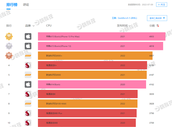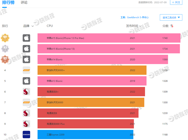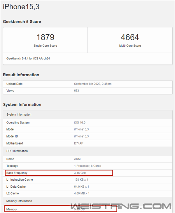正式发布后,iPhone 14 Pro的首个跑分在GeekBench 5数据库中出现,这也是我们第一次前瞻A16处理器的真实性能实力。 机型识别为iPhone15,3,CPU最高频率3.46GHz,主板代号D74AP,运行iOS 16.0操作系统。 成绩方面,单核1879,多核4664。 对比上一代A15的典型成绩单核1722、多核4674来说,单核仅提升9%,多核甚至下滑了。不过,有数码博主称,多核成绩有些反常,可先忽略,待未来更多机型跑分成绩公布后,再对照评估。 参考快科技手机CPU天梯榜,A16的单核依然是冠绝全球,对比安卓阵营最强的天玑9000+、骁龙8+等领先幅度高达40%以上,多核领先幅度也有接近两位数。 另外,识别规格也确认,iPhone 14 Pro采用6GB RAM。 据了解,A16处理器采用4nm工艺,CPU依然2性能核+4效能核,GPU是5核,AI引擎还是16核,晶体管数量比A15增加6.6%、每秒操作次数增加8%、主频增加7%。 |