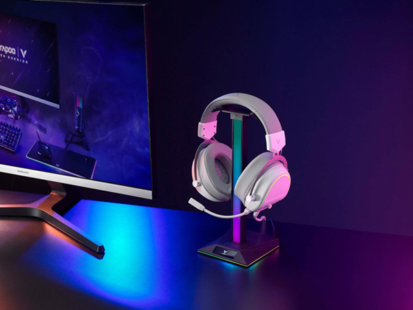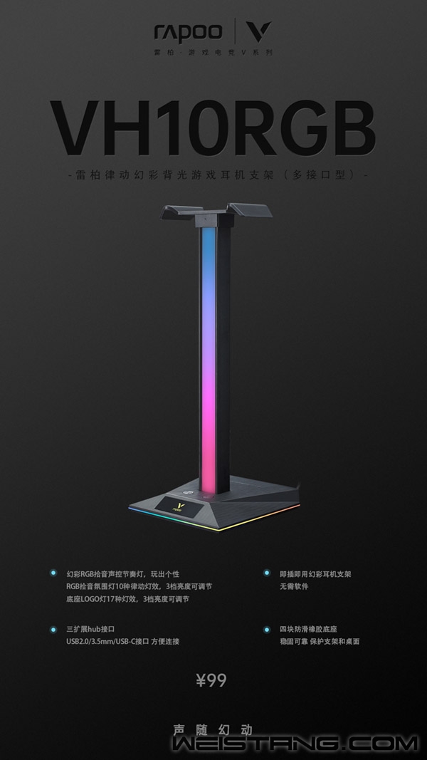 游戏桌面场景可以在个性一点吗?电竞氛围可以更炫一点吗?可以与场景氛围进行互动吗?RAPOO雷柏凭借自身的技术能力,以沉浸式场景化为航标;新品上线:带有RGB拾音氛围灯,10种幻彩RGB律动,17种底座RGB魔幻灯效;三种扩展接口便利设备连接;游戏V系列产品矩阵增添新成员,雷柏VH10RGB律动幻彩背光游戏耳机支架(多接口型)上市!建立与桌面场景氛围的精神桥梁~给桌面场景笼罩“光”属性附魔~ 律动幻彩,声光同步 是工具载体,也是视觉氛围的源泉输出。RGB拾音氛围灯可根据周围声音律动节奏富于变化;通过拾音氛围灯切换按键可调节10种不同幻彩模式与底座17种灯效。一边是激烈、瞬息万变游戏画面下一敲一记的触发,一边是凭借出色的RGB灯光整合,给予VH10RGB掌握“光”的变化属性覆盖面。通过一切人为因素与自然因素为灯光氛围变化所服务,无需软件,即插即用,建立工具如人之间的沟通密码,在游戏中让精神与视觉得以享受。 便捷多用,防滑稳固 VH10RGB不仅对于桌面场景氛围灯效有个性的变化设计,更是把便捷多元化赋予其中。支架底座各配备了一个USB2.0/USB-C以及3.5mm的hub接口,三种不同拓展接口给用户提供不同的设备连接、数据传输、音频传输等,方便连接使用;配合底部四块防滑橡胶,有效防止使用过程中发生位移,游戏声效输入在耳机一音一频之间,耳机规整放置在一抬一落之中,多面兼顾便捷规整的桌面场景。 无论是对于反应要求极高的FPS游戏,抑或是感官配合至上的MOBA游戏,沉浸的游戏体验需要高能外设平衡游戏难度挑战,游戏鼠标、机械键盘、游戏耳机、鼠标硬垫、游戏麦克风、游戏手柄,雷柏V系列电竞游戏全家桶产品矩阵添新,游戏耳机支架,声光同步,带来场景化游戏全面体验的新答案。 |