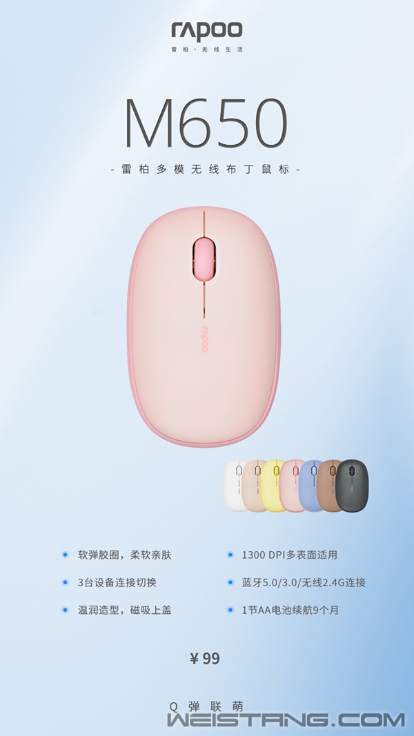 【彩色桌搭】为主题,选择雷柏M650多模无线布丁鼠标,将属于天真、清新、酸甜、浪漫与轻盈的色彩融入设计,用颜色治愈生活,回到最轻松自在的状态。聚焦便携,呈现独特风格与现代都市精神的生动交汇,以“多模无线”的概念诠释无束缚的力量与萌趣的平衡之美。 7款精致新布丁,以扁平造型颠覆传统口味 No.01 香芋紫 No.02 咖啡棕 No.03 柠檬黄 No.04 奶油白 No.05 奶茶色 No.06 蜜桃粉 No.07 芝麻灰 M650以布丁为设计灵感起始,彩色色块点亮空间中的彩色单品。奶茶色的茶香雅致,提神醒脑,战胜压力,让你轻松镇住职场!柠檬黄的清新美妙,微酸中带着自然的甘甜,清俊脱俗的口感,双倍享受!扁平化的造型饱含张力,硅胶圈握持手感,让手指在操控过程中感受新质感,缓解压力。 兼具功能性与标志性风格,M650支持蓝牙5.0、蓝牙3.0和无线2.4G三种连接方式,可在电脑、平板、笔记本等多台设备之间切换,融合“无线生活”和“高效率生产力”,搭配E9050G刀锋无线键盘,随心切换不用设备、不同使用场景,无限表达,出色控场。 1300 DPI高精度寻迹引擎,定位准确,皮革、纸张、树脂等不同材质桌面适用,以实用装点日常的生活。M650多了一些别出心裁的设计,轻音按键、可拆卸磁贴式上盖、电池接收器收纳仓,全程尽享顺畅、高效、便携、愉悦的舒适体验。 不同的色彩、材质在此交织,在“多模无线”视角下,协同创作。 |