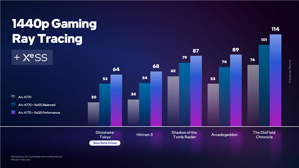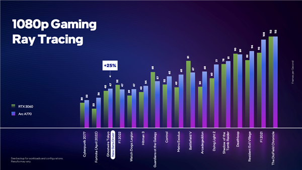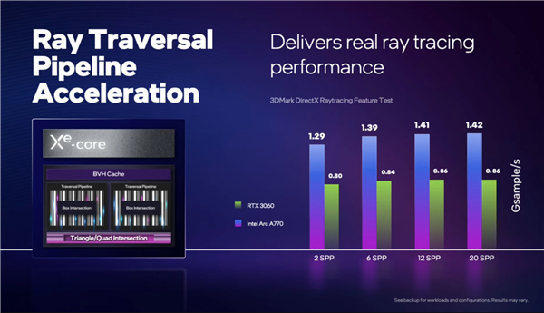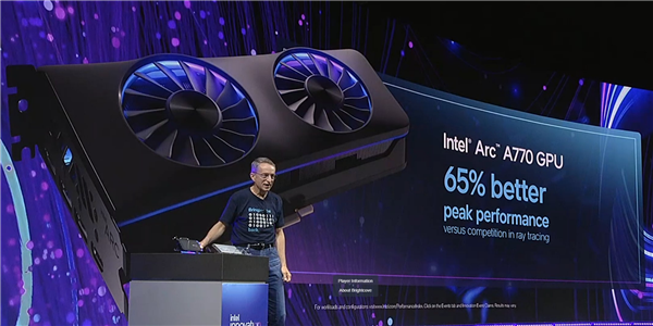 NVIDIA上周发布了RTX 40系列显卡,售价7199到12999元,显卡10月12日正式开卖,今天的创新大会上,Intel也发布了Arc系列最高端的显卡Arc A770,上市时间也是10月12日,正面刚NVIDIA的意味浓厚,不过售价只有329美元起。 Intel显卡从高到低分别是Arc 7、Arc 5及Arc 3系列,不过Intel官方用的是高性能游戏、高级游戏及增强游戏,不提什么高中低端,之前已经上市的是A380,现在主要是高端的Arc 7系列。 7系列的旗舰是Arc A770显卡,10月12日上市,售价329美元起,不过Intel对定价信息并没有说得很详细,这个起价很有可能是8GB显存版的,A770还有16GB显存版,而且还有限量版,价格是418美元。 规格方面,A770是满血32组Xe单元,最高16GB显存,带宽560Gbps,频率2100MHz,256bit位宽,TDP功耗225W,公版采用双风扇散热,颜值要比AMD及NVIDIA的显卡高多了。 至于性能,Intel官方公布的是A770显卡的光追性能比竞品高出65%,这个竞品指的是RTX 3060显卡,下面有更详细的性能对比。 不仅有光追加成,Intel这边还有自己的XeSS技术,类似NVDIA的DLSS或者AMD的FSR 2.0,也是通过AI加速游戏性能,官方公布在开启XeSSS之后性能大增,最高能翻倍,少说也有25%以上的领先,平均提升50%左右性能问题不大。 Intel会在30日正式发布Arc A770及A750等显卡,届时会有更详细的信息,今天很多细节都没有公布呢。 |