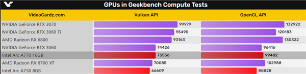 Intel将在10月5日晚上21点开放Arc A770、Arc A750显卡的性能评测,这也是Intel第一代全新独立显卡的两款顶级型号,定位竞品是……RTX 3060。 GeekBench数据库里已经出现了它们的跑分成绩,嗯,不太好看。 二者的测试均搭配i9-12900KS处理器、ROG Z690 APEX主板、32GB DDR5内存。有趣的是核心频率检测最高都是2.4GHz。 Vulkan测试中A770 16GB得分为73536,A750 8GB得分为66609,相差约10.4%。 OpenCL测试中则分别是99482分、88828分,相差约12%。 Vulkna测试偏游戏,OpenCL测试偏计算,前者自然更有价值,所以以此为基准,对比RTX 3060,A770差了区区1.2%,A750则低了10.5%。 当然,这和真实的游戏性能仍然有所不同,静静等待评测吧。 |