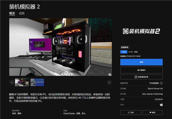 《装机模拟器》是各位云装机玩家最好用的工具之一,还能满足大家用上高端硬件的心理。 现在,全新升级的《装机模拟器2》来了,带来了职业模式、定制功能等等,可以使用40个以上的硬件品牌的真实组件,打造出你梦想中的究极PC。 目前《装机模拟器2》已上架Epic商城,并同步开启预购,首发优惠到手价90元。 根据官方介绍,在职业模式(Career Mode)中玩家可以开启属于自己的PC业务,学习如何组装并修复PC,升级工作间,并随着升级而解锁新的工具与设备。同时赚取利润,看着好评飞涌而来。 在自由装机模式中(Free Build Mode)则可以挥洒你的创意,从超过1200种部件中进行计划,并组装强力性能的PC。 安装升级的开环水冷系统,超频电脑的CPU、GPU,并调整内存运行时机来进一步提升性能。使用3DMark以及Cinebench打分系统来测试并优化你的设计。 需要注意的是,“云装机”也是有一些配置要求的,最低配置为一颗i5-3570处理器+一张GTX 1050 Ti显卡。 而如果想要获得60帧,或是更好的画面效果,则需要用上i5-10400+GTX 1660的组合。 |