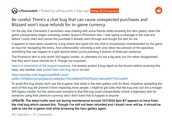 近日,有用户在《守望先锋》的Reddit板块上反馈,称自己在游戏中遇到了在没有进行操作的情况下,游戏自动购买英雄皮肤的情况。 同时,根据其他用户的反馈,这一Bug并非偶发现象,还有多名用户同样“被”购买了皮肤。 用户认为,这一情况是《守望先锋:归来》中存在的一个Bug,而暴雪官方也很快承认了这一问题的存在,并已经进行了修复。 不过,虽然在“自动购买是Bug”这件事上,暴雪与玩家达成了共识,但暴雪似乎并不打算对此做出任何补偿。 在该用户与暴雪官方进行联系后,官方明确拒绝了退款的要求,并坚称“所有的解锁都意味着交易已经最终成交,如果你认为游戏有问题而导致了购买,请通过官方论坛提供反馈”。 目前,该用户已经将暴雪的说法分享在了社交媒体,但官方尚未对此作出进一步的回应。 |