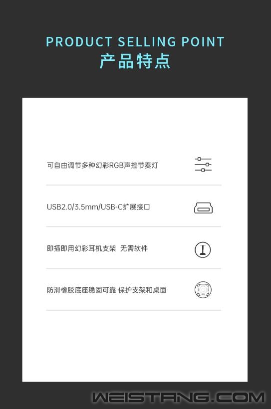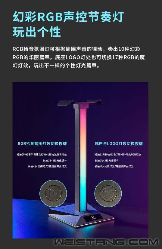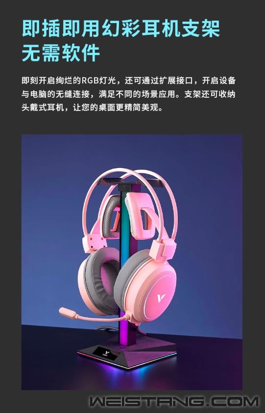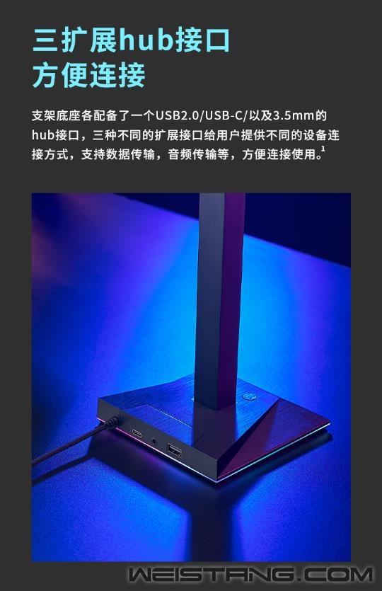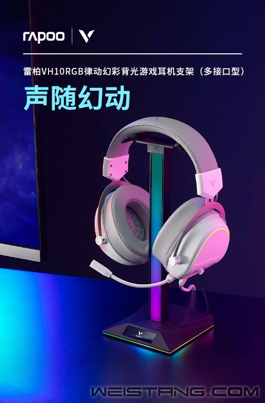 领军国产外设品牌,实力大厂上市企业Rapoo雷柏推出VH10RGB律动幻彩背光游戏耳机支架(多接口型),带有RGB拾音氛围灯,10种幻彩RGB律动,17种底座RGB魔幻灯效;三种扩展接口便利设备连接,建立与桌面场景氛围的精神桥梁,接下来让我们一起来看看这款游戏耳机支架的表现吧。 VH10RGB搭配幻彩RGB声控节奏灯,可根据周围的声音律动,奏出10种幻彩RGB的华丽篇章。底座LOGO处也可切换17种RGB的魔幻灯效,玩出不一样的个性篇章。 支架底座配备了一个USB2.0/USB-C/以及3.5mm的hub接口,三种不同的扩展接口给用户提供不同的设备连接方式,支持数据传输,音频传输等,方便连接使用。 即插即用的幻彩耳机支架,无需软件即可开启绚烂的RGB灯光,还可通过扩展接口,开启设备与电脑的无缝连接,满足不同的场景应用。支架还可收纳头戴式耳机,让您的桌面更精简美观。 支架底部配备了四块防滑橡胶底座,可以有效防止使用过程中发生移位,保护支架和桌面。 |