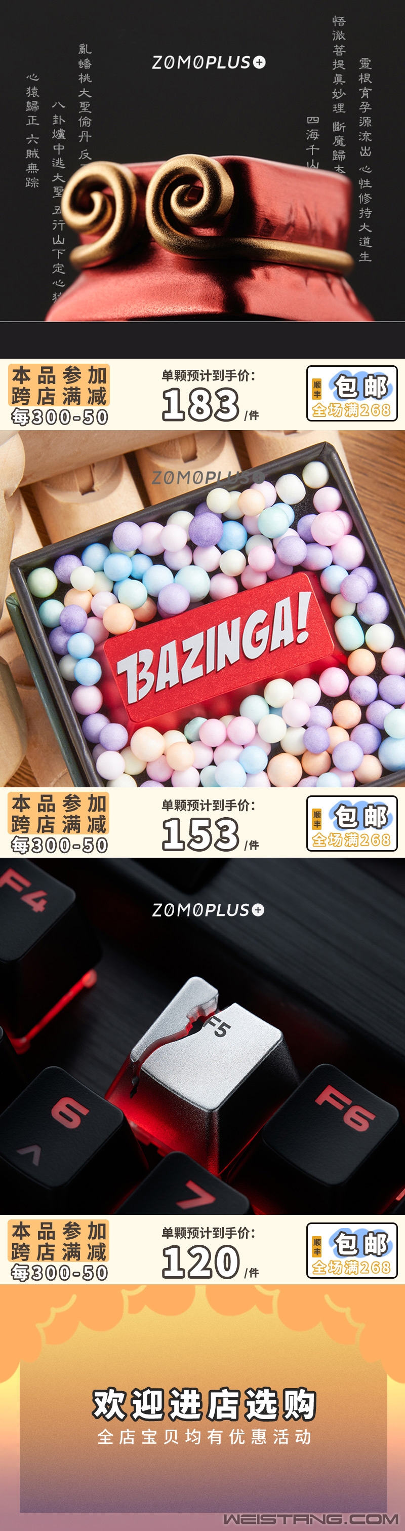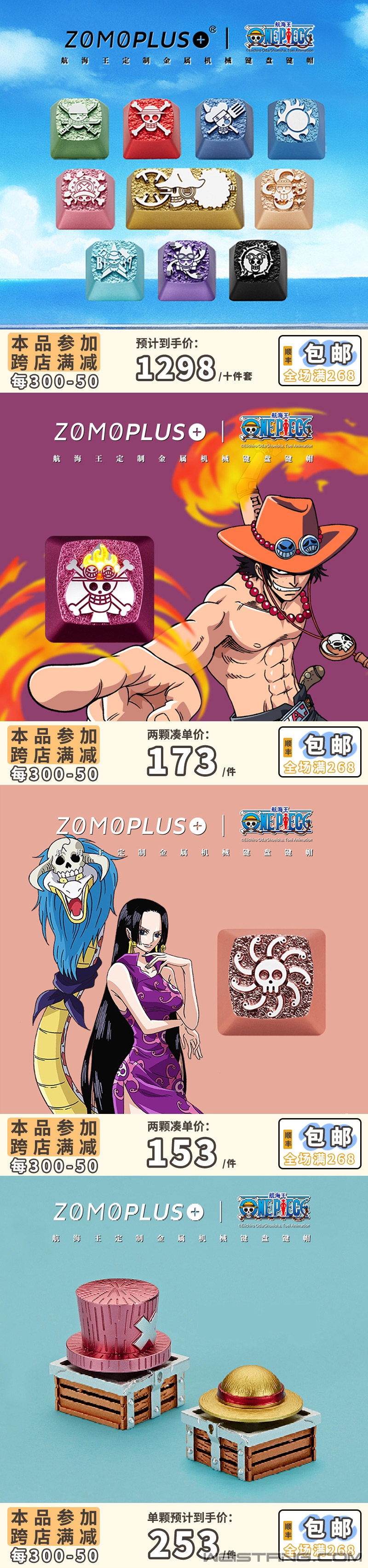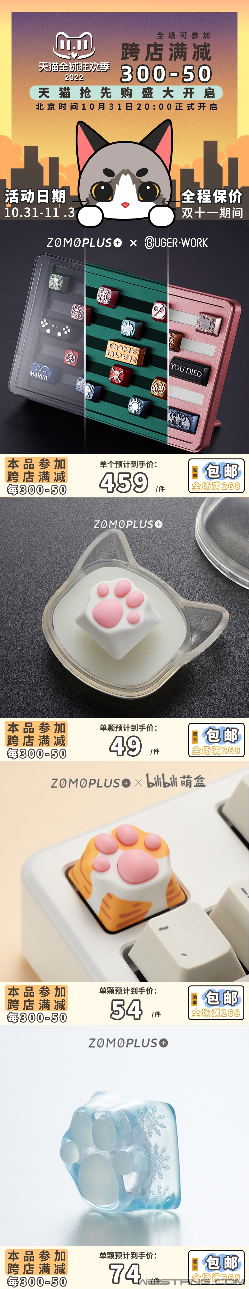 为即将在11月初到来的五周年庆,ZOMO准备了一系列创新产品。10月31号开始到11月3号的双11抢先购活动ZOMO也是力度空前。 新的海贼王系列键帽使用3D打印技术,制作了悬浮在伟大航路的入口的ONE PIECE,和水道后守候的鲸鱼拉布。小黄鸭键帽将有10款类型之多,依托长年制作销售现货键帽的经验,价格比猫爪键帽还要实惠。还有与指尖文创合作的ZOMO首款套帽,双11临近,新品即将一一曝光,敬请关注。 今年是单颗键帽首次进入跨店满减范围,ZOMO大部分产品将支持满300-50的优惠政策,等待入手键帽的朋友可参照图二,加购收藏等待活动上线。 zomoplus天猫旗舰店:https://zomoplus.tmall.com/ |