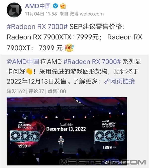 就在北京时间 11 月 4 号凌晨,AMD 发布了新一代 7000 系列显卡,而这次的发布会距离英伟达的 40 系显卡发布,只隔了一个月多一点。 好家伙,今年下半年可真够热闹的,不仅有英特尔 13 代处理器和英伟达 40 系显卡登场,AMD 更是连开两场,先后发布了 7000 系列处理器和 7000 系列显卡。 而前段时间经过很多媒体的评测,AMD 的 7000 系列新处理器多半是干不过英特尔挤爆牙膏的 13 代,所以不少人也对这次的 7000 系显卡捏了一把汗。但是这次的显卡,你别说,好像还真有戏。。。 这次登场的是旗舰系列 RX 7900 XT 和 RX 7900 XTX 显卡,分别采用 20GB 和 24GB 显存,都采用了新的 RDNA3 架构。同时 AMD 走的和英伟达并不是一个路线,AMD 这边更讲究能效。因为 7900 XTX 在性能大幅度提升的同时,需要的最高功耗只有 355W 。。。 这是什么概念呢?隔壁 4090 的功耗是 450W 。功耗不高的同时,7000 系列显卡仍然采用了双 8-Pin 接口,不会出现 4090 那种转接线自燃的奇妙状况 ( 虽然多半是代工的锅 ) 。。。 而且 AMD 还特意展示了显卡的尺寸控制得当,升级显卡其实很简单,机箱电源啥的都不用换,即插即用。 如果你看过我们之前的评测,应该都见识过 4090 是个非常夸张的庞然大物,对空间有限的机箱极其不友好。 同时,7900 XTX 在 4K 游戏的性能和上一代旗舰 6950 XT 相比提升了 70% ,但发布会上好像没怎么和友商进行比较。 不比的原因其实托尼可以理解,因为 4090 性能实在是太强了,是真的比不过啊。。。不过托尼掐指一算,7900 XTX 性能比 6950 XT 强 70% ,那整体确实要比 4090 弱一些,不过这个倒也在意料之内。 7900 XTX 的性能多半在 4080 16GB 和 4090 之间,虽然干不过力大砖飞的 4090 ,但是欺负一下 4080 还是没问题的。而 7900 XT 的 GPU 核心数量和 3090Ti 同为 10752 个,其他参数则各有胜负,托尼估摸着性能可能在 3090Ti 和 4080 16GB 之间。 但相比较性能,托尼之所以说 AMD 这次显卡有戏的原因,是因为价格。7900 XT 和 7900 XTX 的价格分别是 899 美元和 999 美元,国行价格为 7399 和 7999 元。。。 这又是个啥概念呢?隔壁 4080 16GB 和 4090 的售价分别是 1199 美元和 1599 美元,对应着 9499 和 12999 元。。。无论价格和功耗都比英伟达的 40 系显卡更低,就连旗舰级显卡也没超过 8000 元,AMD 这波定价超出了很多人的意料。Lisa 苏の笑容 ▼ 而对于许多消费者来说,我为什么不花 8000 块买一张比 4080 16GB 性能更强的 7900 XTX 呢? 大家千万不要忘了,消费者对价格是很敏感的,按照单位价格能够买到的算力来看,AMD 这波是真的香。。。 不过话虽这么说,AMD 在发布会上还是展示了不少花活,毕竟自己的主场必须有排面嘛。比如除了前面提到的体积和功耗控制十分合理,新显卡还支持了 DP 2.1 接口! 简单来讲,DP 2.1 除了支持 Type-C 接口之外,还能支持高达 8K 分辨率加上 165Hz 刷新率的画面输出,还把三星和 LG 一众显示屏厂商给拉出来了。 发布会上同样提到了光线追踪这东西,人家英伟达叫 RTX ,我直接叫 RT 。 众所周知,在光线追踪这方面,英伟达可以说是傲视群雄的存在,A 卡在这方面一直没啥动静。但 AMD 依然展示了一些游戏在 4K 光追拉满情况下的帧率表现,其中 《 赛博朋克 2077 》 能够保持在 62 帧,还算不错,但没有实机演示。 而且和隔壁开了 DLSS 3 的 4090 直接飙到 100 帧相比,确实没那么出彩。。。不过 AMD 也有一个类似英伟达 DLSS 能够提升帧率的技术,叫做 FSR ,但不论是根据网上还是同事们的评价来看,体验都不如 DLSS 。 而这次发布会上公布的 FSR 3 ,帧率相比 FSR 2 能够提升两倍多! 不过很可惜,这是一个画到了 2023 年的饼。。。虽然发布会上确实提到了对标英伟达 RTX 光追和 DLSS 的 RT 和 FSR ,但 AMD 在这方面的实际体验并不尽如人意。 也许是想要进一步弥补这些不足,AMD 发布会上表示,还未发售的两款大作 《 木卫四协议 》 和 《 Forspoken 》 将成为 AMD 的技术合作伙伴。 同时,育碧自家的开发引擎雪莲花也露脸了,这款引擎同样也是 AMD 的技术合作伙伴。 新显卡这么一圈看下来,其实 AMD 这波思路还挺明显的:反正我性能也打不过 4090 ,就不正面刚了,也不讲什么花里胡哨的,就专门讨好玩家。人家发布会上也直接说了,我们这是世界上最先进的游戏显卡。 你看我们不仅能 2K 帧数拉满,甚至还能 4K 或者 8K 打游戏,同时价格也很有吸引力。 至于光线追踪和 FSR ,我们虽然落后不少,但也在追赶了,还勾肩搭背了几个游戏工作室和开发引擎,能看出在努力讨好玩家群体。 这次的 7000 系列显卡体积和功耗控制比较得当,老玩家想换显卡的话,机箱和电源啥的没准压根就不用换。这个操作反而在和自家的 7000 系列处理器反着来,7000 系列处理器可是要连主板和内存条都跟着换新的才能用上。。。 所以综合看下来,7000 系列显卡给托尼的感觉,更像是一款 “ 经济适用型高性能显卡 ” ,听起来很怪,但确实是这么回事儿。尤其是这个充满诱惑力的价格,会显得 40 系显卡的溢价尤为严重。。。 7900 XTX 真正的实力,还是要看实际评测数据,才能知道它的性能到底如何。另外,AMD 这波操作还做了一件好事,那就是隔壁 4080 16GB 可能要降价了。。。最后,你要是问我 AMD 这次能不能 YES ,我觉得能,但不完全能。 先不说实际体验如何,发布会上讲的这些东西确实能够看出来 AMD 在努力追赶英伟达,毕竟光有显卡性能是不够的,技术层面的支持也得跟上才行。 啥时候 AMD 真的能把光