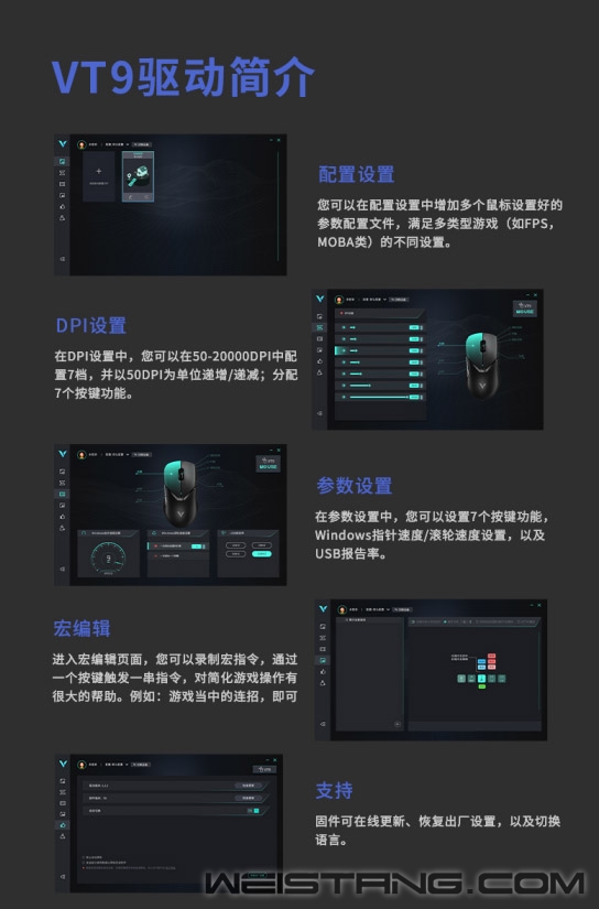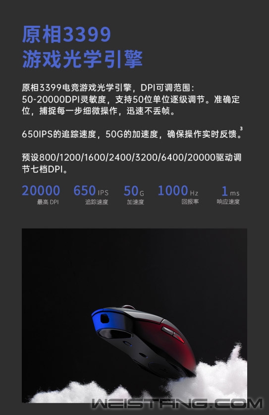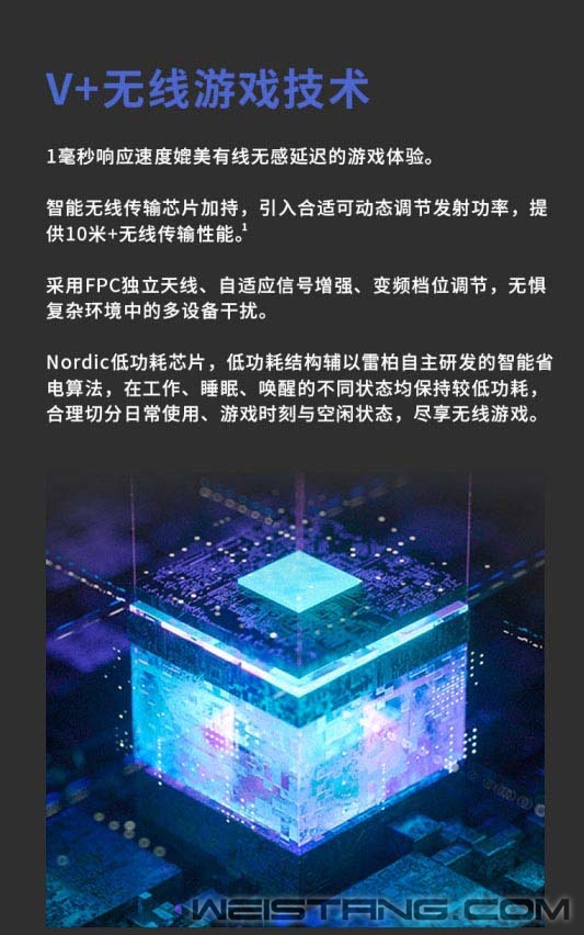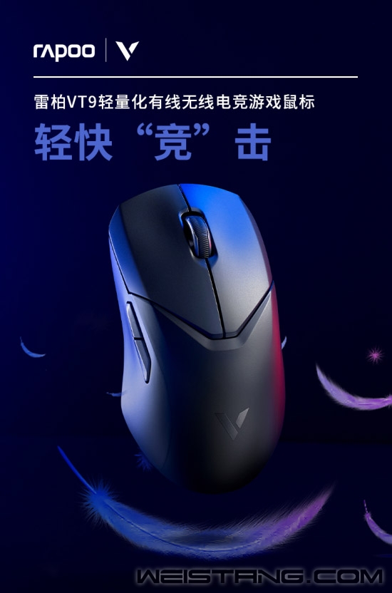 够轻、续航够久、性能够强、性价比还够高,Rapoo雷柏近日推出的VT9轻量化有线无线电竞游戏鼠标,轻装上阵。78g量化的“轻”,最高160小时的续航,给舒适游戏加个码;“V+无线游戏技术”与原相3399引擎的结合,给性能提个速。接下来让我们一下来了解一下这款鼠标还有哪些亮眼之处。 鼠标约78g重量左右,外壳纤薄,移动整体轻盈与耐用并存,人体工学左右对称的设计,支持抓/捏/趴三种不同握姿,使用时保持舒适握持感。长时间操作也能舒适有佳。 鼠标搭载雷柏V+无线游戏技术,1毫秒的响应速度,媲美有线无线的延迟体验。智能无线传输芯片的加持,提供10米+的无线传输性能。采用FPC独立天线,自适应信号增强,变频档位调节,无惧复杂环境中的多设备干扰。Nordic的低功耗芯片,辅以智能的省电算法,合理切分日常使用、游戏时刻与空闲时刻,尽享无线游戏。 鼠标800毫安时可循环充电锂电池,搭配新升级低功耗无线技术,至高可达约160小时续航使用,USB-C连接充电,3小时充满。 原相3399游戏光学引擎的性能基石,预设800/1200/1600/2400/3200/6400/20000循环切换7档DPI,并支持50位单位逐级调节,650IPS的追踪速度,50G的加速度,准确捕捉不丢帧,确保实时反馈每一步操作。 内置欧姆龙5000万次微动,搭配电竞型50万次刻度手感滚轮,触发更迅速,点击力度更均匀,疾速响应防误触。搭配底部采用特氟龙脚垫,低摩擦、耐磨、实现快速顺滑操作。 底部设有隐藏型磁吸收纳仓与无线充电模块扩展仓,放置/取出便利自如,避免接收器易丢失烦恼。 VT9提供10键可编程,驱动可设置多种扩展功能。亦可保存多组配置文件,实现多场景切换操作,登录V系列智能云存储,可将配置文件上传至云共享,分享给其他玩家。 掌握了强劲的性能,在细节方面也是做到了兼顾,给予玩家更舒适的操控选择。1.8m伞绳材质的电源数据线,镀金的USB接口,USB转接器,按键防滑贴&备用脚贴的加入,种种的细节让玩家得到更完美的游戏体验,犹豫即败北,冲! |